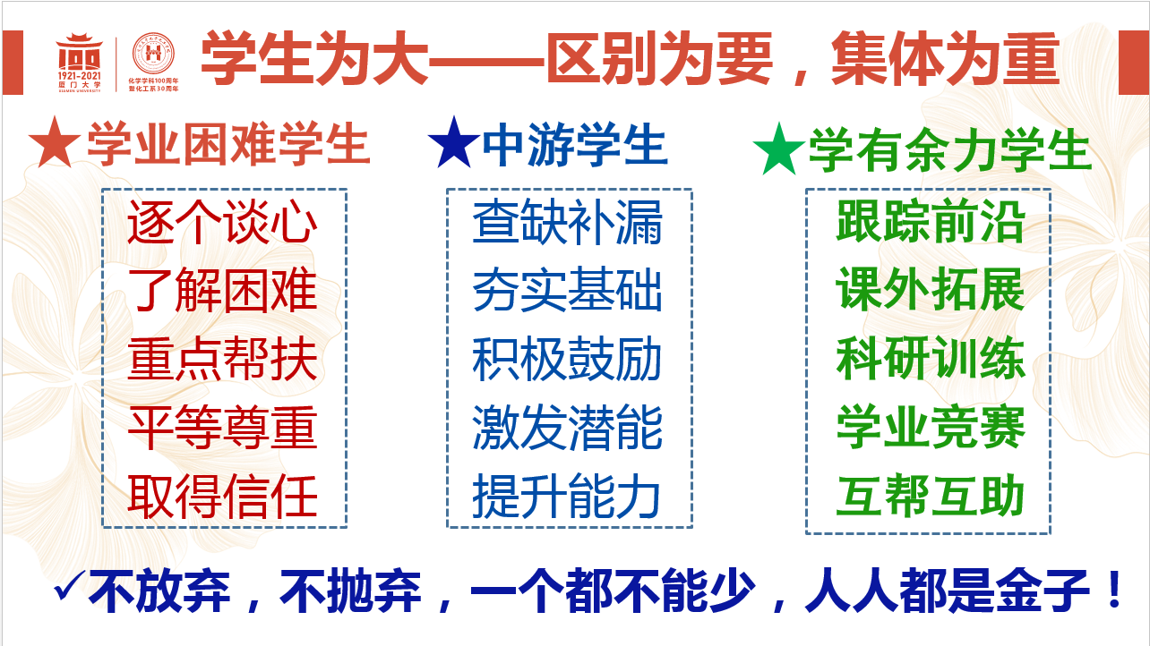 2017级生物工程班班主任王海涛老师认为每个学生都是金子,都有他们的闪光点。她从成绩到性格,认真梳理每个学生的基本情况,对学生进行分类指导,让班上每个学生本科四年都过得有意义,有成就。