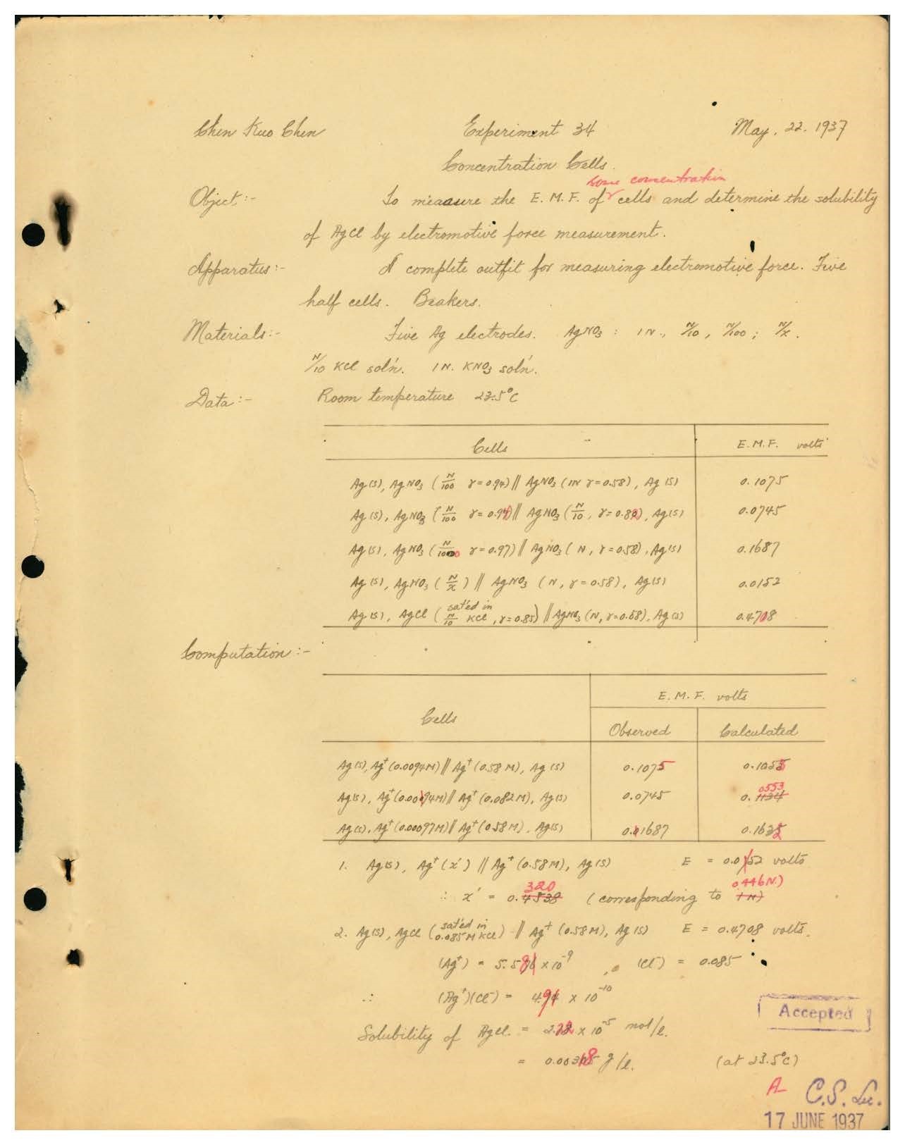 卢嘉锡批改的陈国珍1937年5月22日的物理化学实验报告