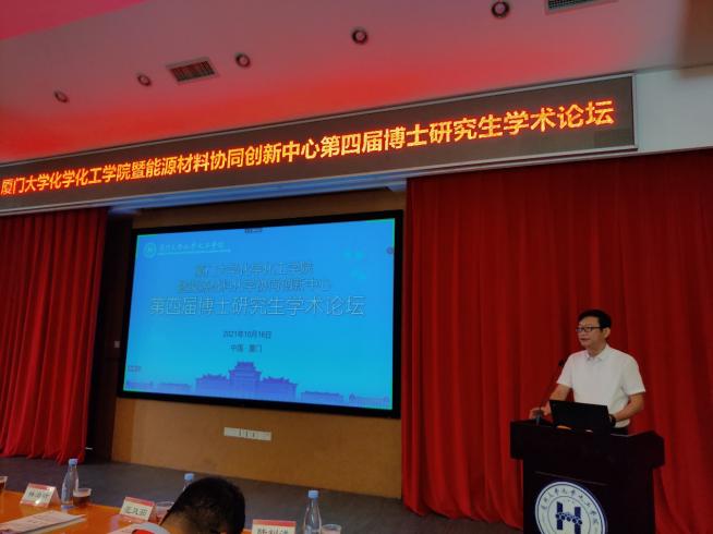 10月16日,厦门大学化学化工学院暨能源材料化学协同创新中心第四届博士研究生学术论坛在化学报告厅召开。学院党委书记宋毅、副院长任斌教授、党委副书记李芬芬、化学系主任温庭斌教授、化工系主任王远鹏教授、邀请报告人汪骋教授,来自厦门大学、复旦大学、中国科学技术大学、南开大学、天津大学、湖南大学、大连理工大学的中高年级优秀博士生代表,以及学院2021级全体博士生,共计200余人参加会议。论坛特别邀请了方宁、乔羽、林海昕、范凤茹和陆钊洪5位博士生导师担任口头报告和墙报的专家评委和点评嘉宾。
