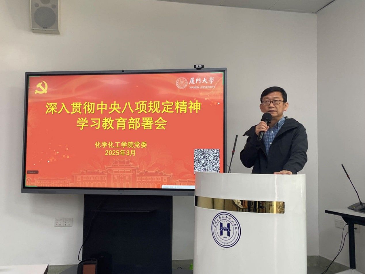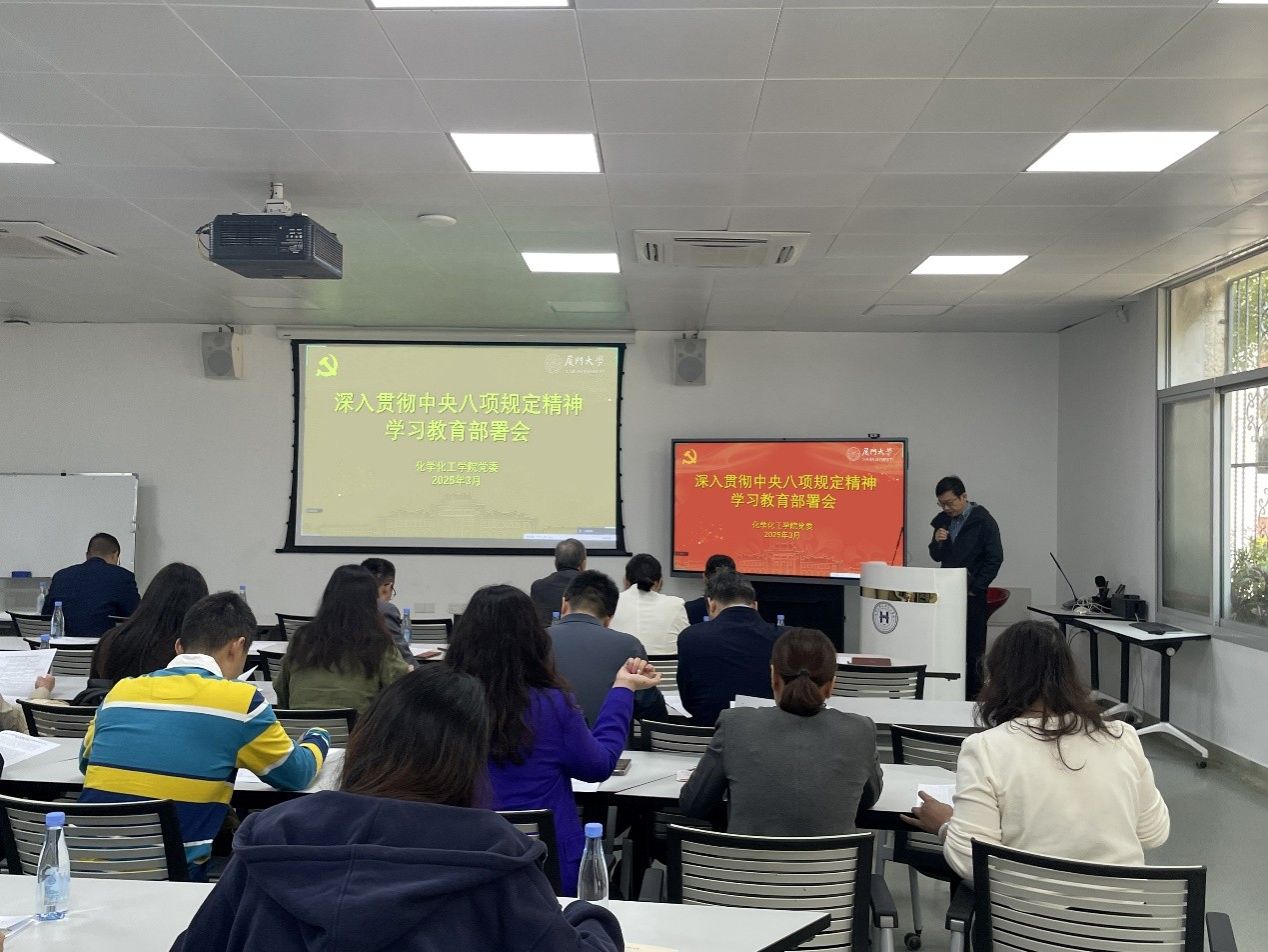 3月24日上午,化学化工学院在同安二106会议室召开党委(扩大)会议,传达学习中共中央、教育部党组关于在全党开展深入贯彻中央八项规定精神学习教育工作的部署,审议通过《化学化工学院深入贯彻中央八项规定精神学习教育实施方案》,在学院正式启动深入贯彻中央八项规定精神学习教育。校基层党建工作联络员白锡能莅会指导,会议由学院党委书记宋毅主持。