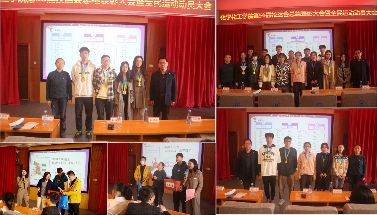 会议期间,学院为每位运动员都准备了刻有本人姓名和参赛项目的奖牌与纪念书签,由学院党委副书记刘俊杰老师与聂鑫老师为优秀运动员代表颁奖。现场还进行了激动人心的抽奖环节,奖品包括拍立得、蓝牙耳机、运动腰包等,全体学生踊跃参与,气氛十分热烈。