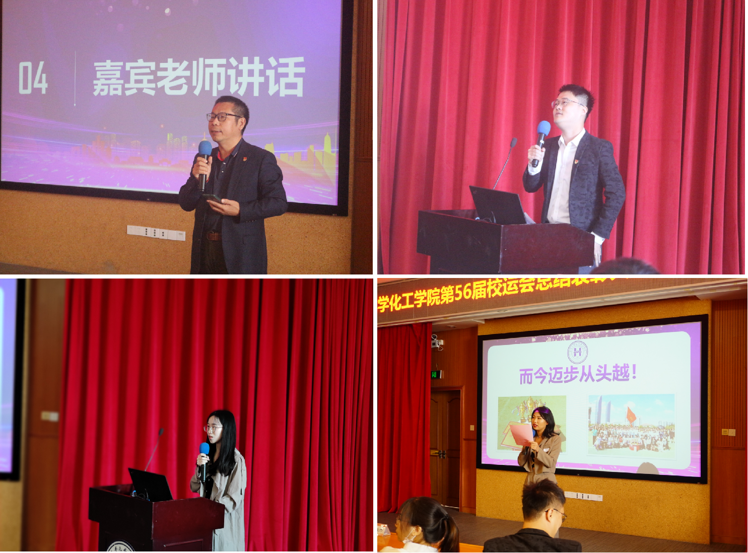 会上,分管体育工作的研究生辅导员尚策分享了自己对本次运动会的感悟并总结成功经验。他首先引用了党的十九届六中全会中的金句“看清楚过去我们为什么能够成功,弄明白未来我们怎样才能继续成功”做开场白,通过认真分析对比最近5年学院在校运会上取得的成绩,结合今年采取的新方法、新举措,最后将成功的原因归纳为三个关键词——“理想”“奋斗”“团结”:在赛前动员大会确立了勇夺第一的共同理想,激励全体运动员燃起拼搏向上的不屈斗志,引导全体学生树立团结一致的坚定信念。归根到底,全院师生在本届校运会上为了共同理想而团结一致、奋勇拼搏是取得佳绩的根本原因。他强调,希望运动员们带领全院师生积极投身全民运动,在后续的各项体育赛事中继续发扬化院精神,为自己、为学院创造新的辉煌。