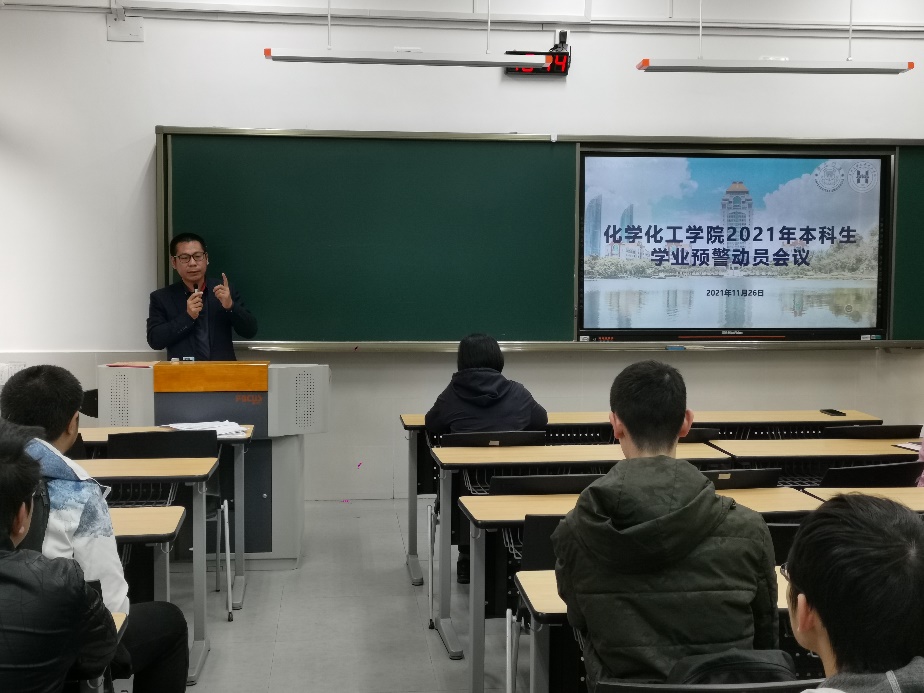 为落实立德树人根本任务,坚守为党育人、为国育才,建设学院良好学风,11月26日,化学化工学院在南强二107教室召开“2021年本科生学业预警和动员大会”。教务处副处长陈雪芬、学院党委副书记刘俊杰、团委书记刘恩恩、团委副书记杨家麒、教学秘书林琳和受到学业预警的学生参加了大会。