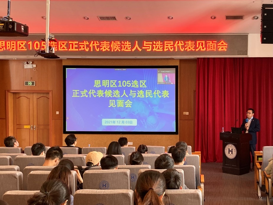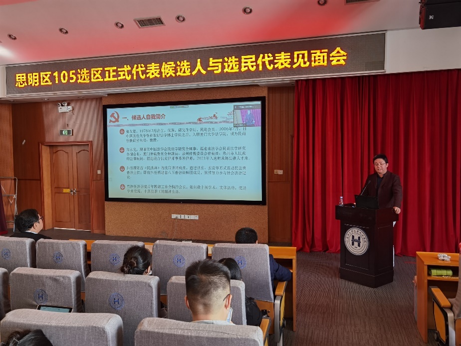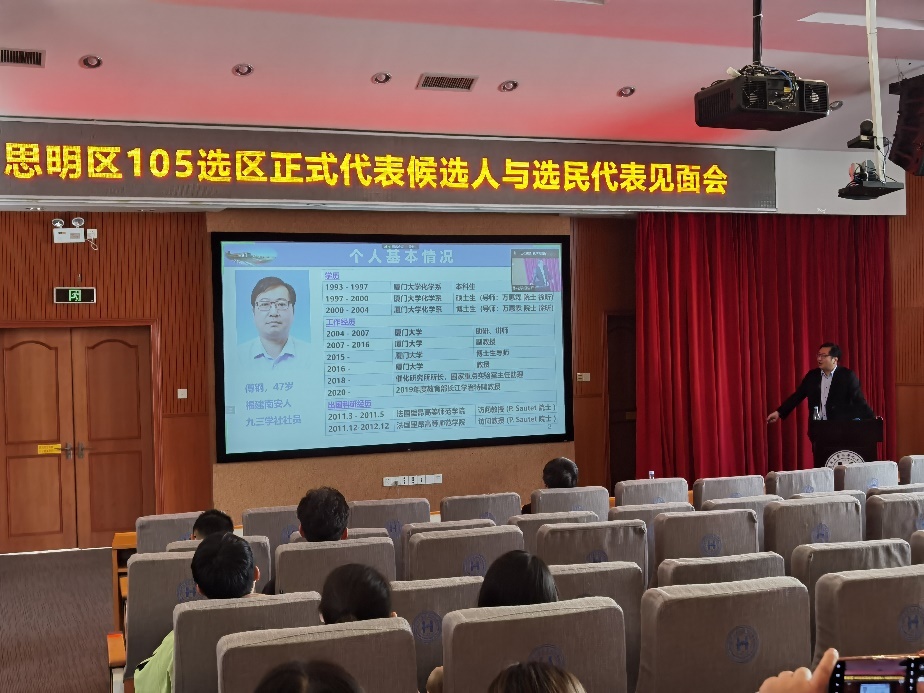 为让选民充分了解正式候选人情况,切实提高选举工作质量,12月3日上午,思明区105选区正式代表候选人与选民代表见面会于厦门大学化学报告厅举行。厦门大学化学化工学院教授、催化研究所所长傅钢和厦门大学法学院教授、民商法教研室主任郑永宽两位正式候选人与来自厦门大学法学院、马克思主义学院、社会与人类学院、台湾研究院、体育教学部、化学化工学院、材料学院和建筑与土木工程学院的150位选民代表面对面交流,同时,开通了在线视频直播通道,让更多的选民参与见面会,深入了解候选人情况。思明区人大换届选举厦门大学办事处秘书组组长、厦大校工会常务副主席叶鹏飞到见面会现场指导察看。会议由刘俊杰主持。