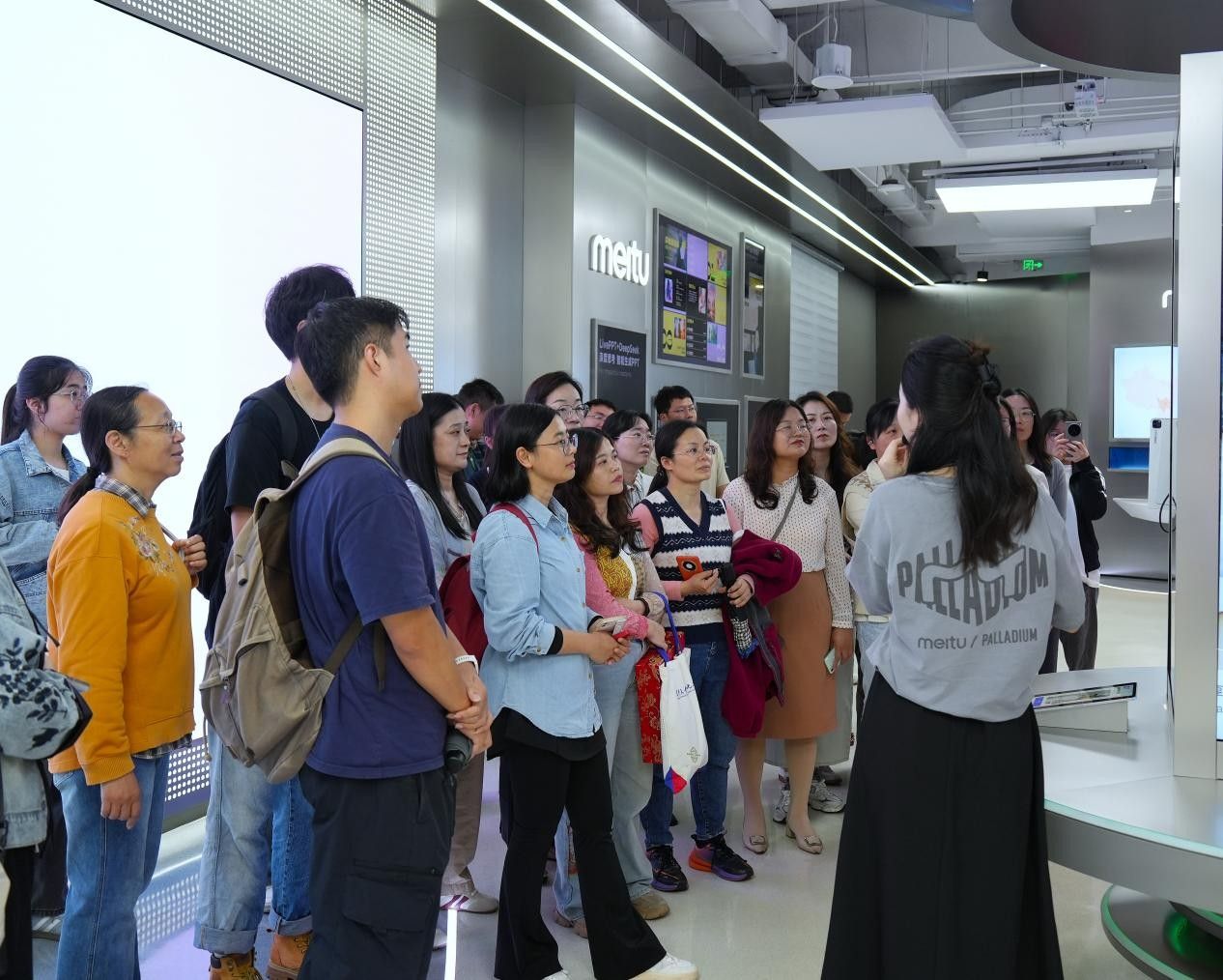 在参观过程中,美图公司行政接待人员详细介绍了美图公司的发展历史。她表示,美图从最初的图像处理软件专注者,逐步拓展业务版图,如今已成长为全球影像科技领域的重要力量。在产品研发上,美图不断加大投入,以满足用户日益多样化的需求;在市场拓展方面,积极开拓国内外市场,品牌影响力与日俱增。此外,美图公司积极践行社会责任,通过 “科技技术赋能公益”,在乡村美育、中国传统文化传承等领域开展系列实践,让技术创新既有“高度” 更有“温度”,这与学院倡导的学术研究服务于社会、以科技助力文化传承与发展的理念相呼应。