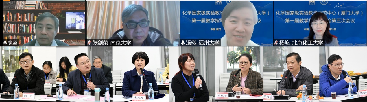 2021年12月31日,化学国家级实验教学示范中心(厦门大学)(简称“实验中心”)第一届教学指导委员会第五次会议以线上线下相结合的方式在厦门大学隆重举行。本届教学指导委员会委员北京大学裴坚教授、南京大学张剑荣教授、北京化工大学杨屹教授、福州大学汤儆教授、厦门大学朱亚先教授、吕鑫教授和任艳平教授参加会议。厦门大学实验室与设备管理处处长施芝元、教务处副处长黄艳萍、化学化工学院党委书记宋毅、院长谢兆雄、实验中心主任曹晓宇、常务副主任邓顺柳、各实验课程主任和实验中心实验技术人员,以及校内外和兄弟院校同行等80余人以线上或线下的方式参加了此次会议。