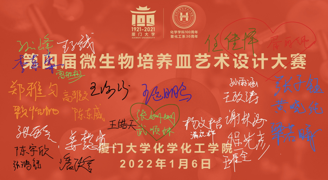 为生动展示微生物世界的魅力,提升校内同学对微生物等学科的学习兴趣,普及微生物的学科基础知识,献礼中国共产党成立100周年、厦门大学建校100周年、厦门大学化学学科创建100周年暨化工系创办30周年,厦门大学化学化工学院生物化工研究所于2021年12月20日-12月27日,举办了第四届微生物培养皿艺术设计大赛。