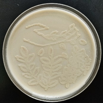 与以往不同,本次比赛平板作画赛道的作画方式做了一定方法的改进,采用两种作画方式,同学的操作变得更加简便,图片选择范围更广。其一为棉签描摹法:使用灭菌细棉签蘸取菌液,在培养基上轻轻描摹图案。生长出形状后可以用灭菌牙签修正边缘。该方法的优点在于可写字或绘制线条复杂的图案,且可在同一块平板上使用多种颜色的菌,缺点是描摹时力度过大可能会戳破培养基,不适合画边缘尖锐的图案(线条宽度约1.5mm)。其二为锡纸雕刻法:在锡纸上雕刻出图案并消毒,覆盖在均匀涂布过菌液的培养基上,紫外照射30分钟后揭去锡纸。该方法的优点是可以提前设计好图案,且图案可以打印,可以生长出边缘清晰的图块,缺点是只能选用一种颜色的菌,锡纸柔软,需特别注意操作力度。