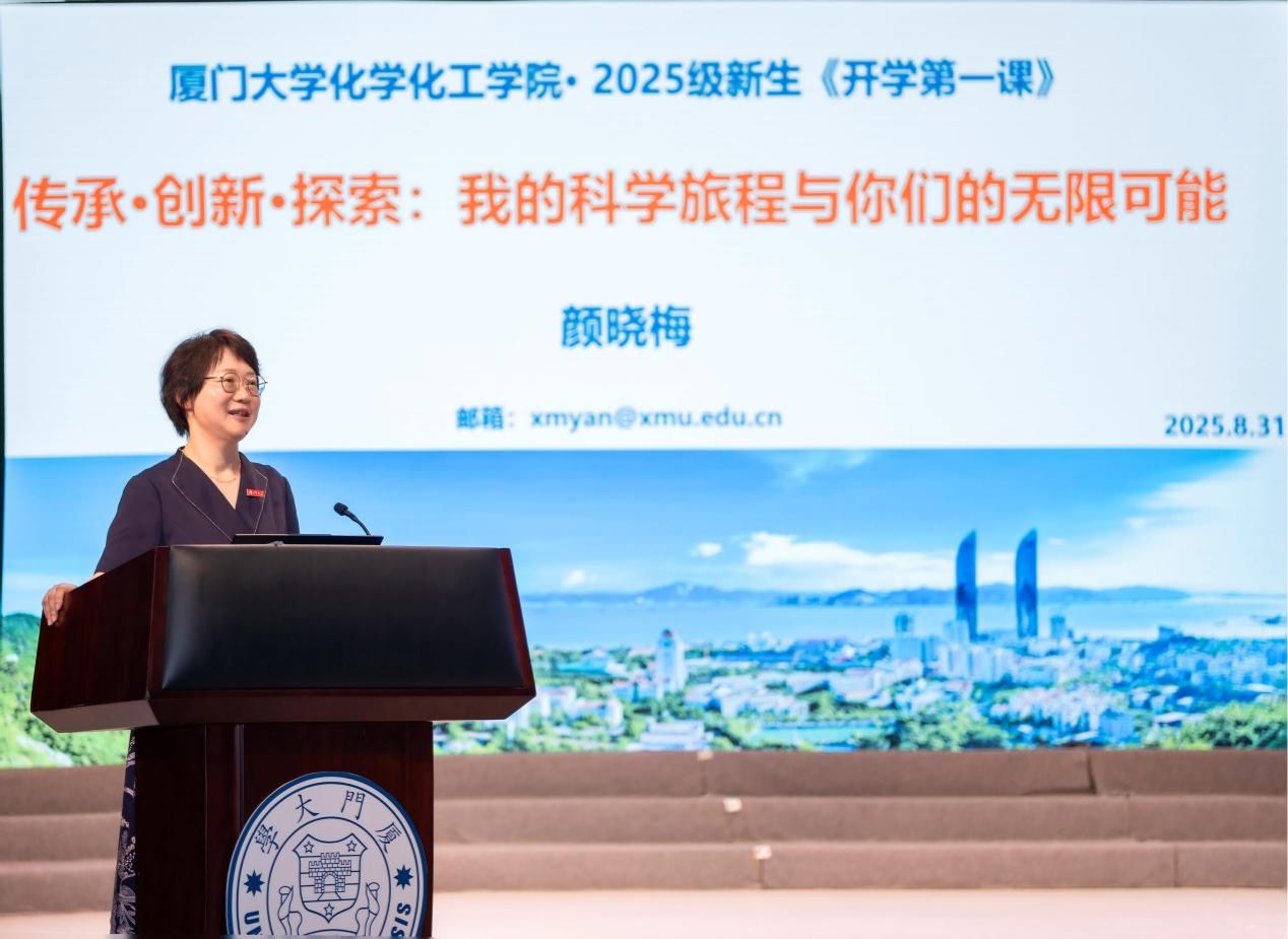 典礼结束后,厦门大学特聘教授、博士生导师,国家杰出青年科学基金获得者颜晓梅教授为全体新生讲授“开学第一课”《传承·创新·探索:我的科学旅程与你们的无限可能》。颜晓梅结合团队自主研发国际领先的纳米流式检测技术以及实现该技术的产业化,推动高端科学仪器的中国智造的经历向同学们阐述“创新,不是天才的专利;突破,也并非遥不可及。专业是同学们跨界突破的起点!”随后,颜晓梅娓娓道来她的导师黄本立院士以及她与她的学生们的故事,鼓励同学们本科阶段要认真学习、坚持锻炼,争取大二或大三进入实验室开展科研训练,培养科研思路;研究生阶段要勤奋、高效,多阅读文献,多与导师沟通,多向师兄师姐请教。山海形胜,润物无声。嘉庚风骨,止于至善。最后,她衷心祝愿同学们在厦大,有奔赴山海的热爱,也有扎根学术的沉静,在南方之强的沃土上,成长为更好的自己。