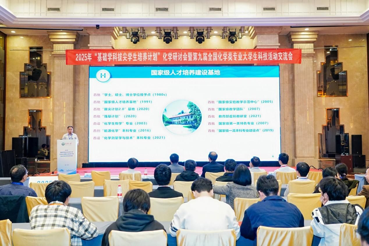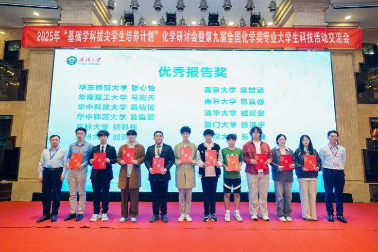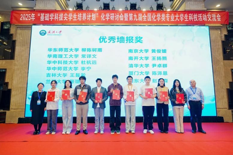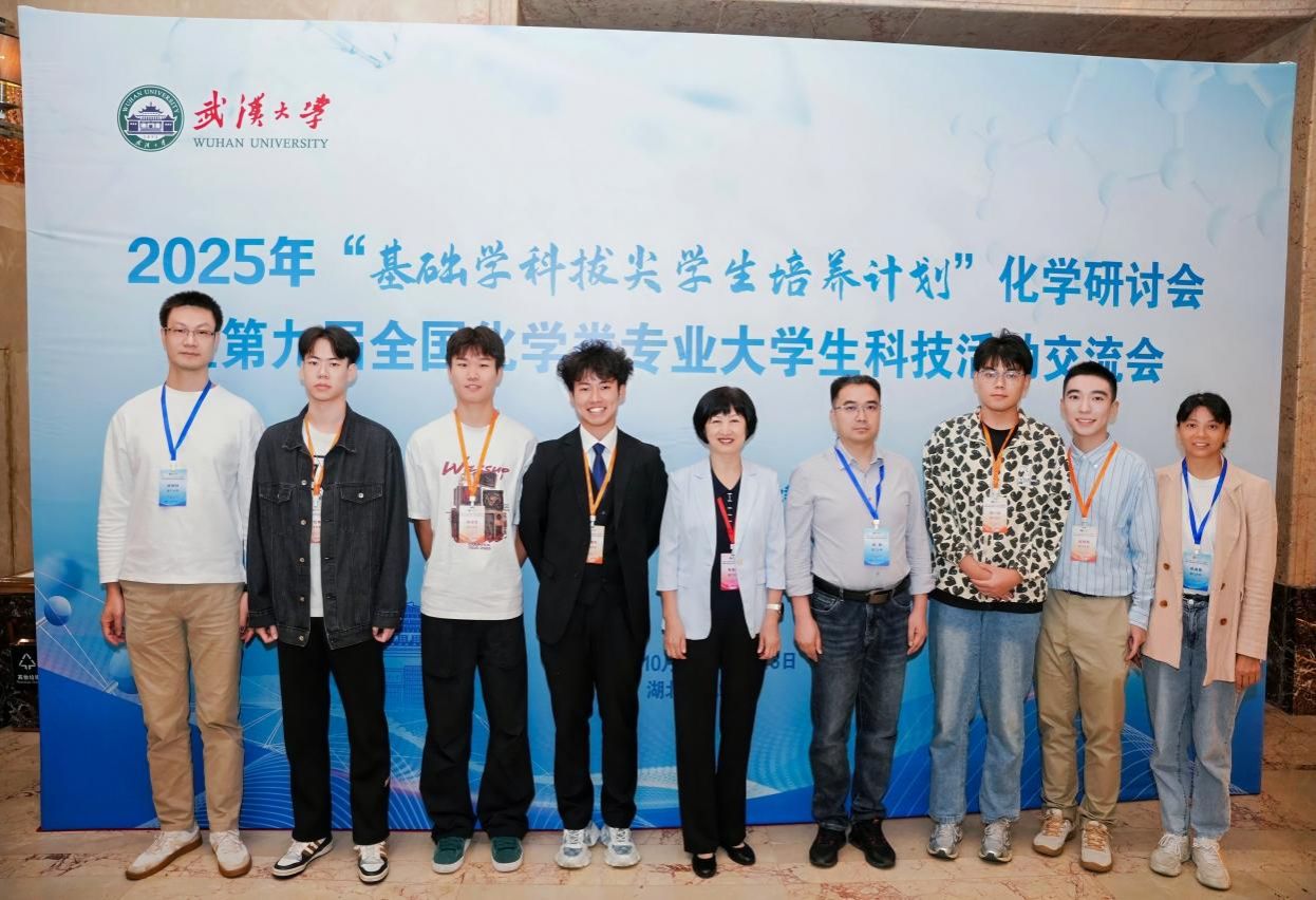 10月31日-11月2日,由教育部高等学校化学类专业教学指导委员会主办,武汉大学化学与分子科学学院承办的2025年“基础学科拔尖学生培养计划”化学研讨会暨第九届全国化学类专业大学生科技活动交流会在武汉举行,全国多所重点高校师生出席了本次学术交流会。我院朱亚先教授作为特邀嘉宾出席了本次会议,2022级本科生段一龙、樊橙希,2023级本科生张泽宇、陈泽恩、李仕琦,化学系副主任匡勤教授、杨柳林副教授等一同参加了本次活动。