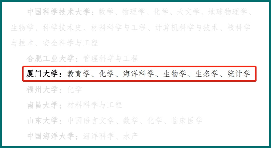 厦门大学入选第二轮“双一流”建设高校名单,教育学、化学、海洋科学、生物学、生态学、统计学6个学科入选第二轮“双一流”建设学科名单。