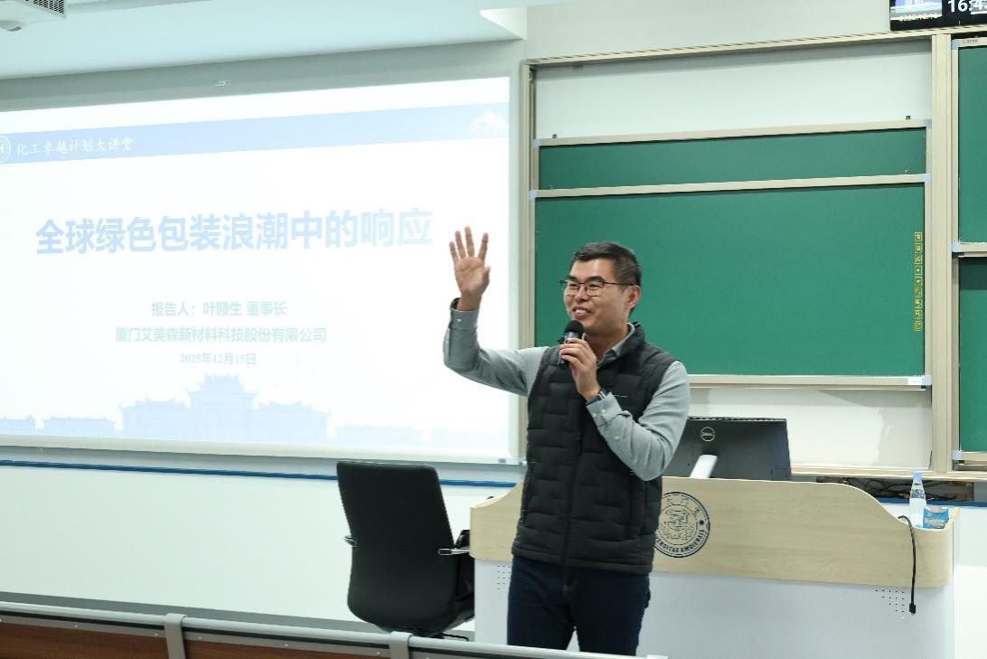 2025年12月15日,我院1997级校友,厦门艾美森新材料科技股份有限公司创始人兼董事长叶顺生应邀返校,在钟铭远楼为师生作了题为“全球绿色包装浪潮中的响应”的报告。报告由化学化工学院化学工程与生物工程系副系主任黄加乐教授主持,并为叶顺生颁发了“化工卓越计划大讲堂”荣誉纪念证书。
