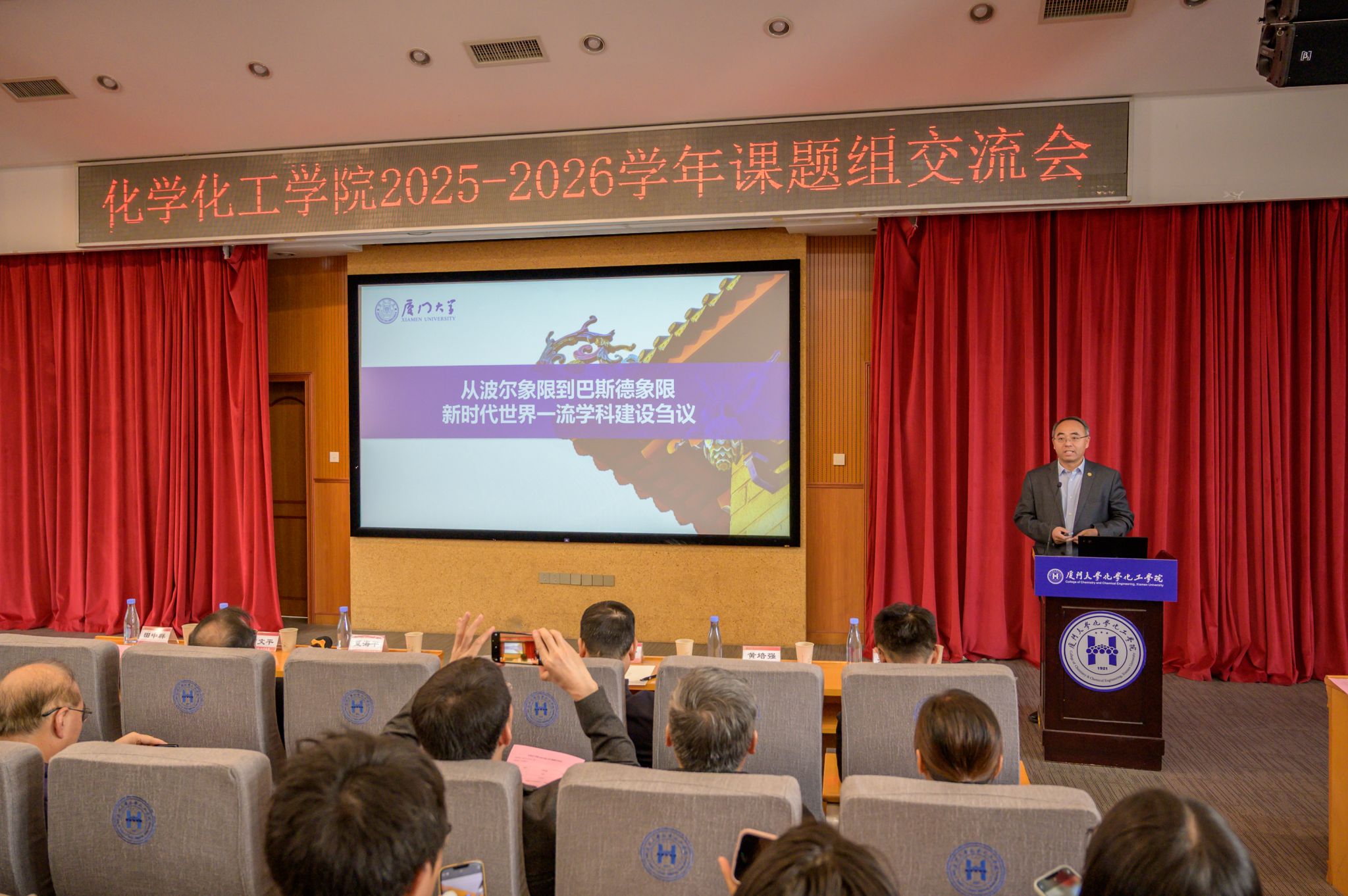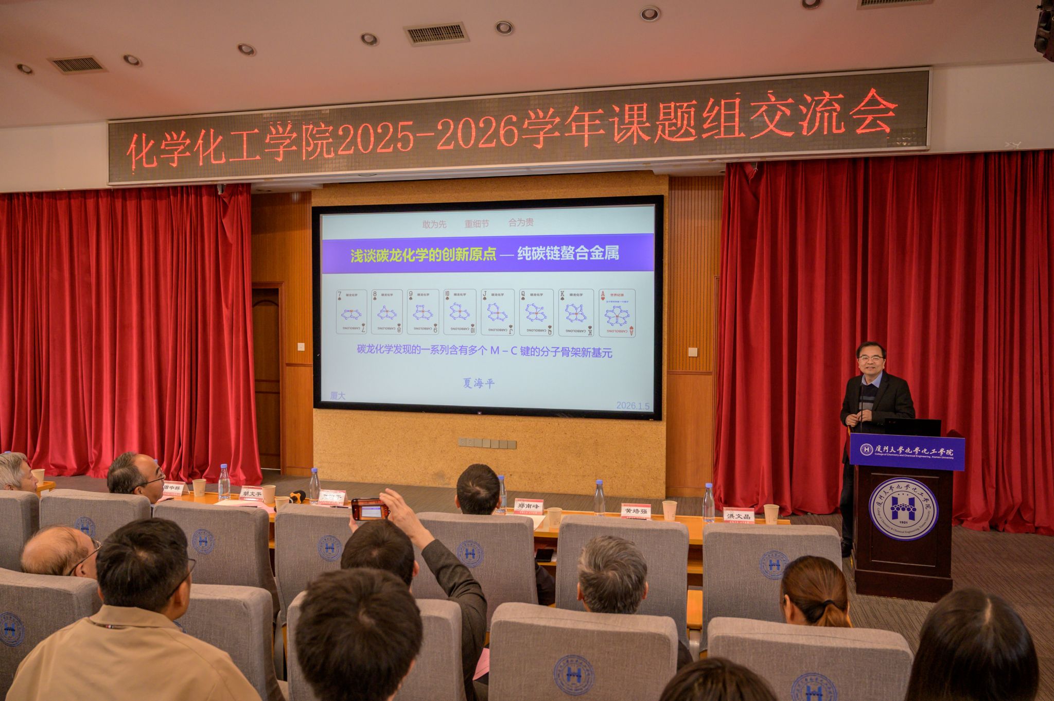 2026年1月5日,厦门大学化学化工学院举办2025-2026学年课题组交流会,全体教职工以及学生代表300余人齐聚一堂。校长、中国科学院院士胡文平,中国科学院院士田中群、谢素原、郑南峰、夏海平,原副校长、中马高等研究院院长江云宝,校长助理、人事处处长谢兆雄,研究生院常务副院长洪文晶等出席会议。