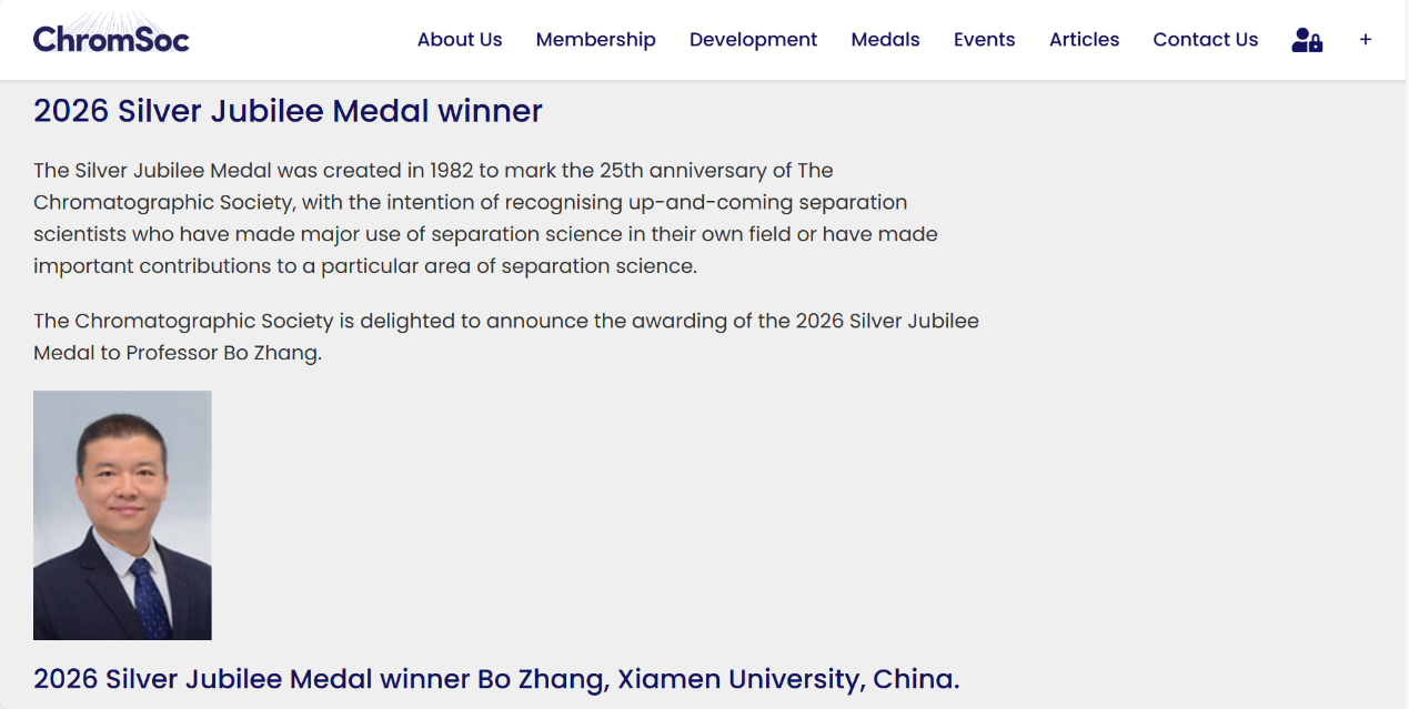 近日,我院张博教授凭其在分离介质精准制造方向的开创性工作荣获The Chromatographic Society(英国色谱学会)颁发的“Jubilee Medal”,成为该奖项自1982年设立以来首位获奖的华人学者。