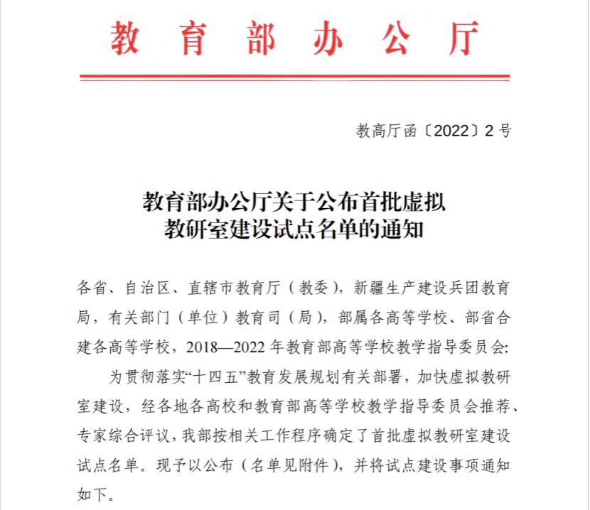 近日,教育部下发《教育部关于公布首批虚拟教研室建设试点名单的通知》(教高厅函〔2022〕2号),由我院牵头的化学专业虚拟教研室成功入选首批试点名单。