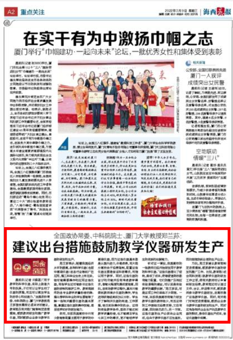 导语:2022年全国两会期间,《海西晨报》开通“两会连线”专栏,连线在厦全国人大代表、政协委员,聚焦他们的使命与担当,传递来自全国两会的“厦门声音”。3月9日,《海西晨报》以《建议出台措施鼓励教学仪器研发生产》为题,讲述全国政协常委、中国科学院院士、厦门大学化学化工学院郑兰荪教授在鼓励教学仪器研发生产方面的提案建议。现将全文转载如下,以飨读者。