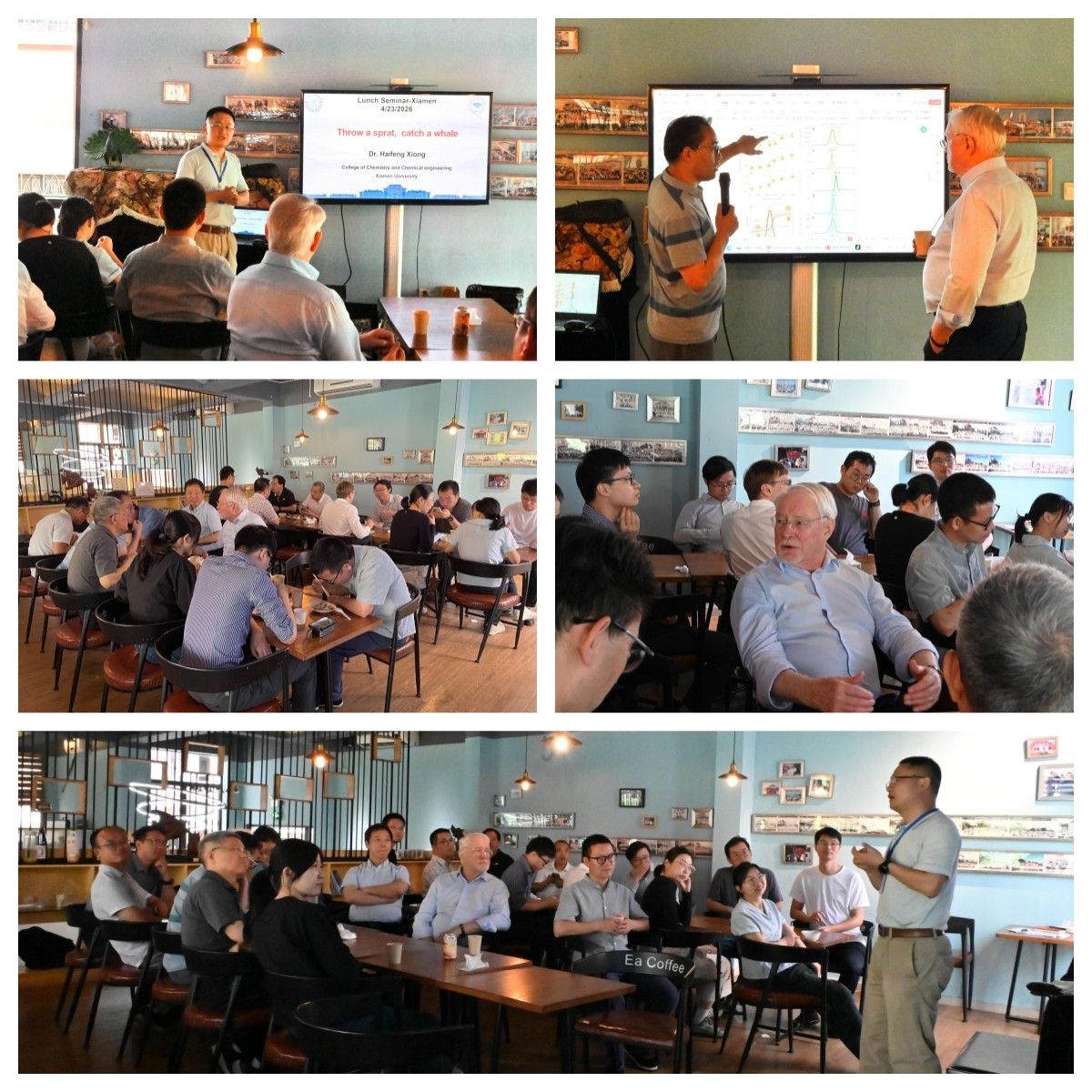 4月23日中午,应学院青年教师提议,厦门大学化学化工学院正式启动“教师午餐会”,旨在搭建促进青年人才学科交叉与交流的常态化平台。首期活动在思明校区Ea咖啡厅举行,以“表界面化学中的催化”为主题。学院院长任斌教授、表界面化学全国重点实验室青年委员会主任熊海峰教授等出席活动。来自厦门大学催化化学、高分子化学与物理、无机化学、分析化学、电化学、结构化学、化工等多个研究方向以及中国科学院城市环境研究所的30余名青年教师参加活动。午餐会由熊海峰教授主持。