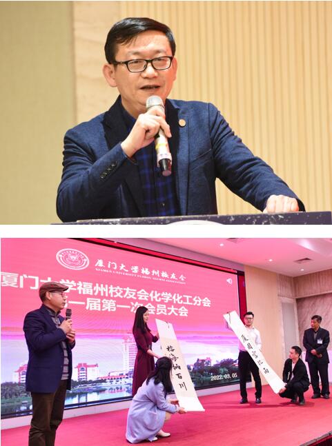 宋毅代表学院向分会送上由刘俊杰亲笔书写的“厦园霑化雨 榕海纳百川”贺词对联。他表示,厦大化院与福州有着深厚的历史渊源,福州是厦大化院的优质生源基地,也是厦大化院人干事创业的一方热土。福州校友会化学化工分会是学院在全国的第八个院友会、百年院庆之后成立的第一个院友组织,分会的成立具有十分重要的意义。希望在榕的广大化学化工校友精诚团结、守望相助,在将个人事业做大做强的同时,继续关心关注母院的建设与发展,为母院的“双一流”建设献计献策、添砖加瓦。