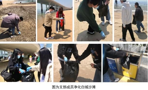 支委会首先为每人分发橡胶手套与垃圾袋,尔后,大家分工协作,分散到沙滩的不同区域积极搜索与清理垃圾,将废弃塑料袋、玻璃瓶、食物、面巾纸等通通收入垃圾袋中。