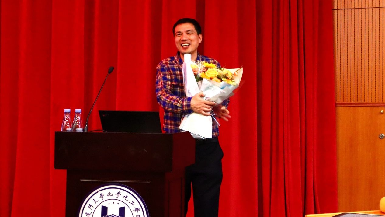 最后,谢老师以盲人用导盲杆识别路面解释扫描隧道显微镜的原理,用逆水中游泳解释逆流聚焦电泳分离过程,更是通过一个泄气的篮球启发了他对称性破缺研究的故事,鼓励我们“要热爱生活,生活中处处有科学,保持一颗好奇心,不断思考,一定可以书写成功的篇章。” 我们也送上鲜花表达对院长学长的喜爱。