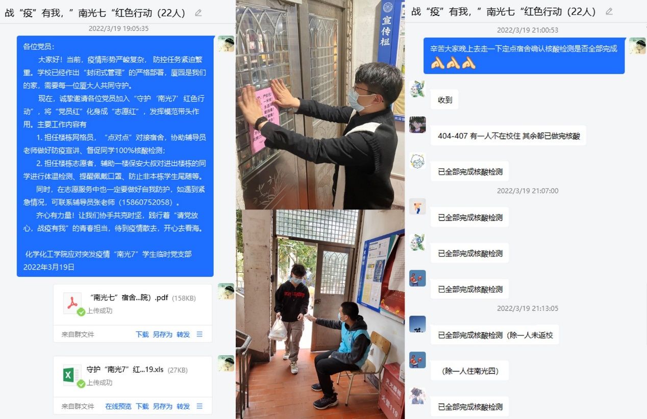 3月14日,在接到学校核酸检测志愿者征集通知后,短短几分钟内学院17名教工党员志愿者积极响应号召踊跃报名。后来部分志愿者因为最新疫情防控要求不能到校、只能居家健康监测的情况下,又有5名教工党员第一时间挺身而出填补人员空缺。其中,黄瑞芸同志更是在腿伤还处于复健的关键阶段毅然选择放弃休息带伤出战。上小学的孩子居家学习没人照顾、刚出生不久的二娃需要哺乳……类似这样的情况还发生在许多教工党员身上,但大家都闭口不提,而是默默地克服困难,奋勇冲在抗疫前线,以实际行动助力学校打赢疫情防控阻击战,让党旗高高飘扬在抗疫一线。