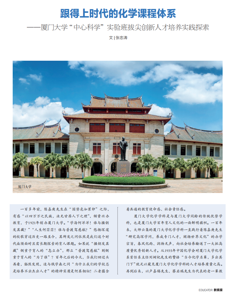 2022年3月,《光明日报》旗下《教育家》杂志以《跟得上时代的化学课程体系 ——厦门大学“中心科学”实验班拔尖创新人才培养实践探索》为题,介绍了我院“中心科学”实验班课程体系。现将全文转载如下,以飨读者。