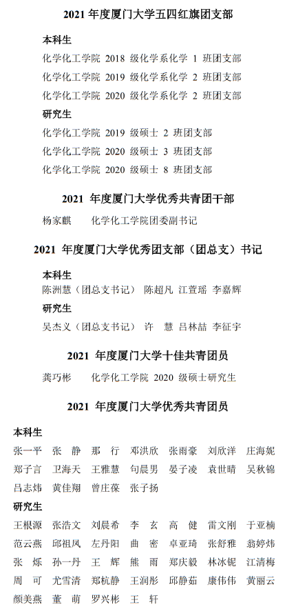 在学校和学院党委以及上级团组织的坚强领导下,2021年化学化工学院团委工作紧紧围绕团的根本任务、政治责任和工作主线,特别是在共青团改革、全面从严治团、服务青年需求、夯实基层团建、服务百年校庆、参与疫情防控等重点工作方面取得了显著成绩。在2021年度厦门大学共青团工作先进集体和先进个人评选中,学院团委副书记杨家麒老师荣获厦门大学年度“优秀共青团干部”称号;2020级硕士研究生龚巧彬荣获厦门大学“十佳共青团员”称号;2018级化学系化学 1 班团支部等6个支部荣获厦门大学“五四红旗团支部”称号;陈洲慧等8名学生荣获厦门大学“优秀团支部(团总支)书记”称号;张一平等50名学生荣获厦门大学“优秀共青团员”称号(名单附后)。