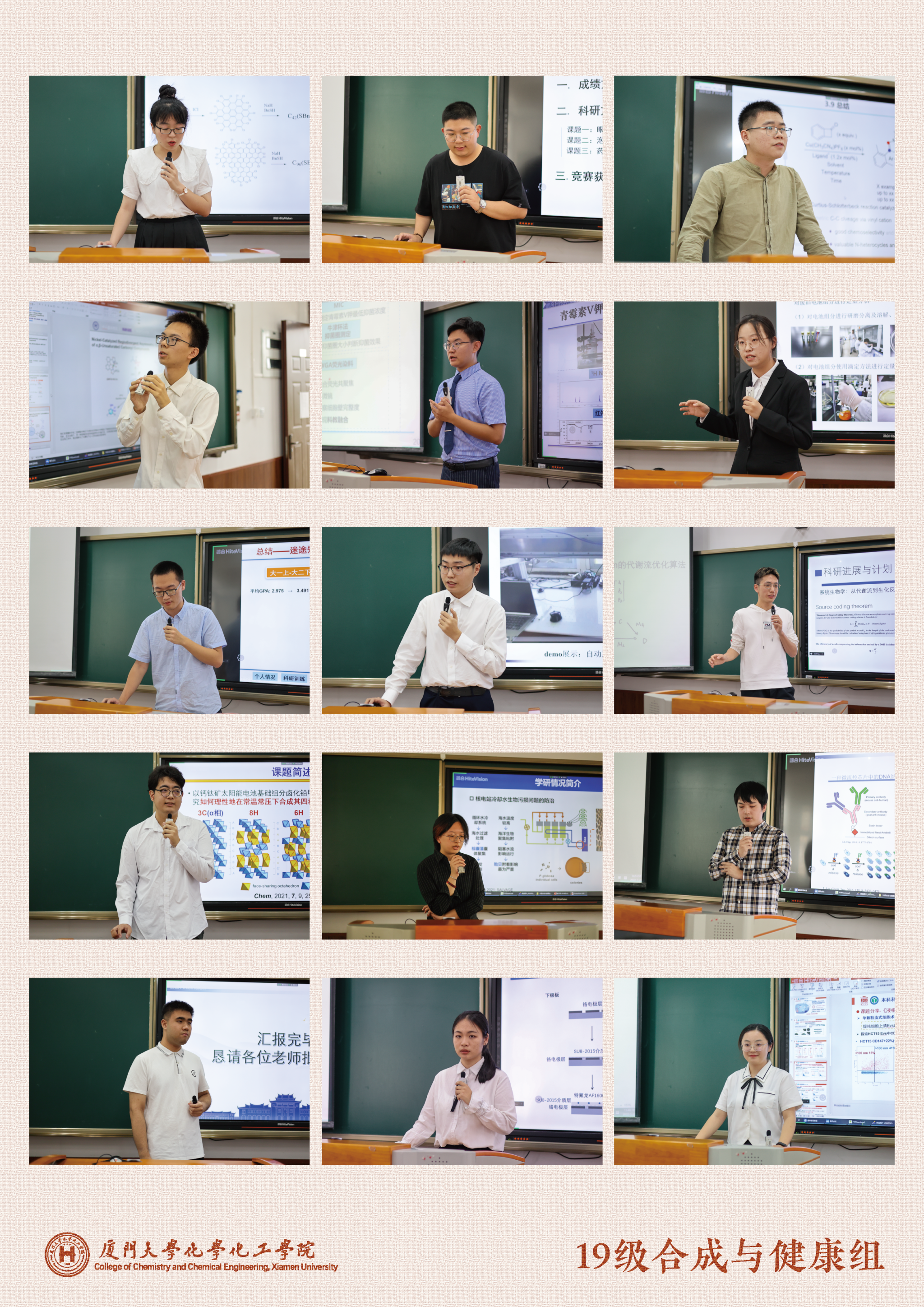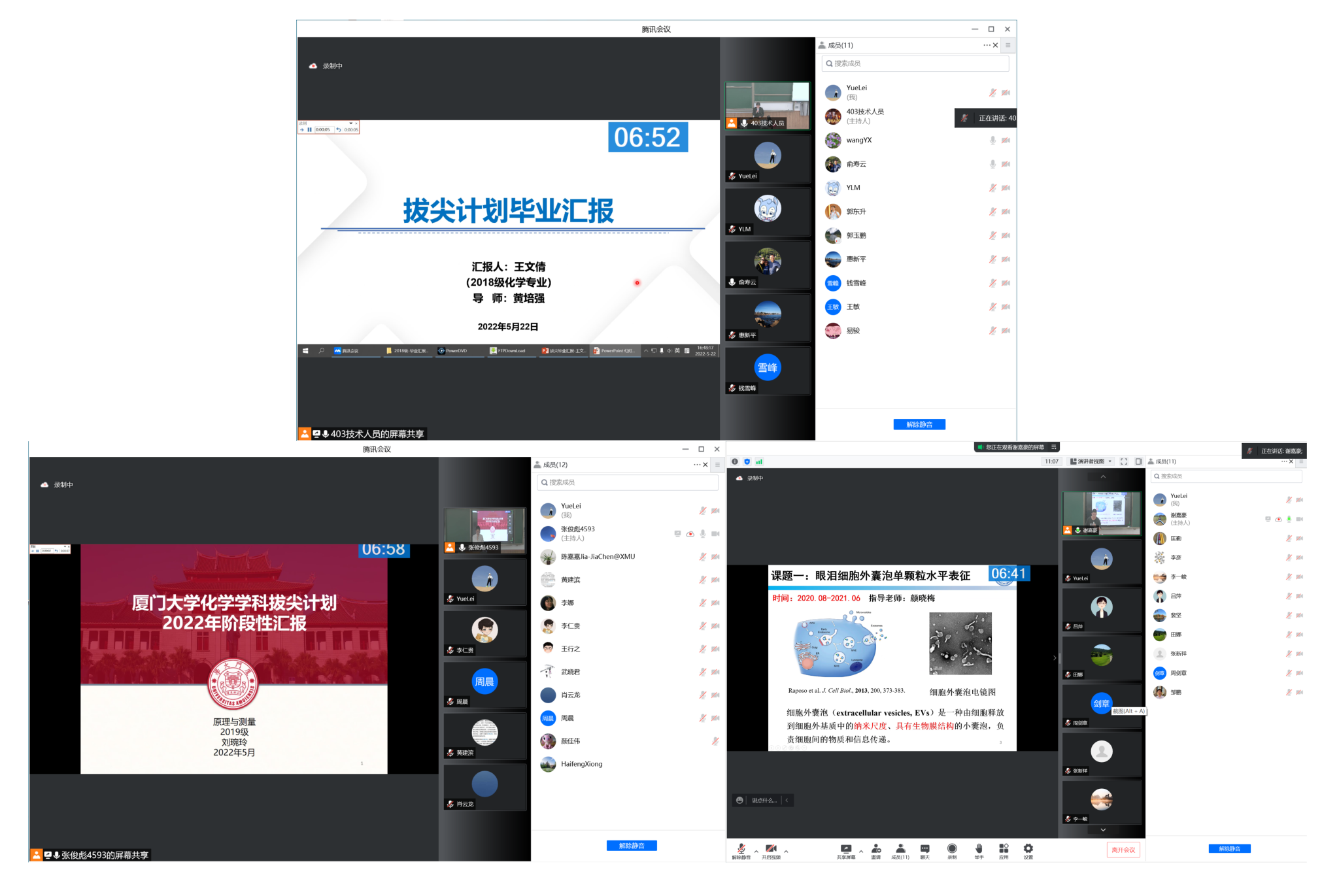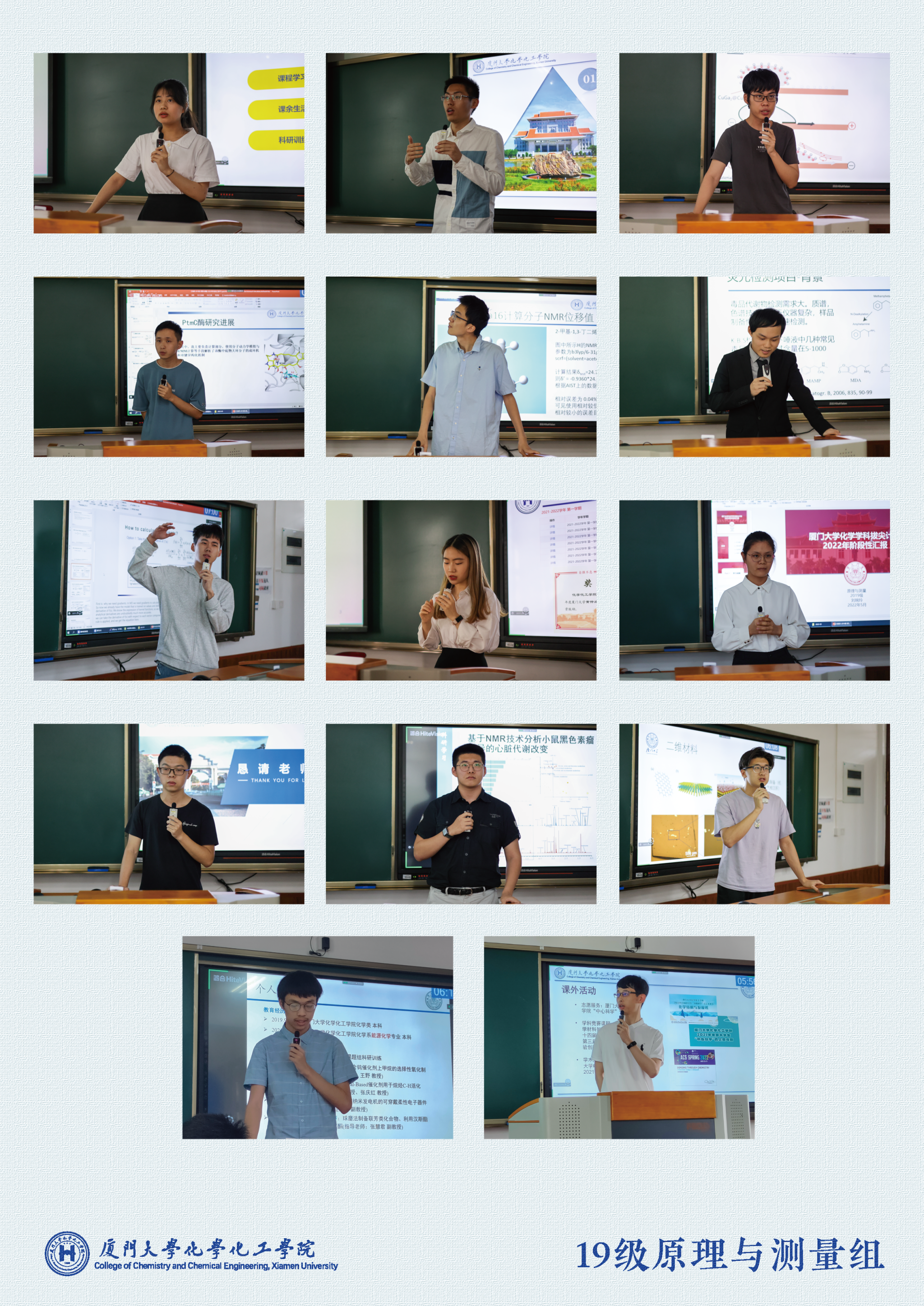 5月22日下午,我院化学拔尖计划2022年高年级学生阶段性考核报告会在南强二403、502、503分为三组以线上线下结合的形式同步进行。本次报告会特别邀请北京大学、浙江大学、上海交通大学、南京大学、吉林大学、中国科学技术大学、南开大学、兰州大学、中国科学院大连化学物理研究所及我校共29名专家评委参会。我院曹晓宇教授、陈嘉嘉教授、苏培峰教授、匡勤教授、王翔副教授线下出席并主持会议。
