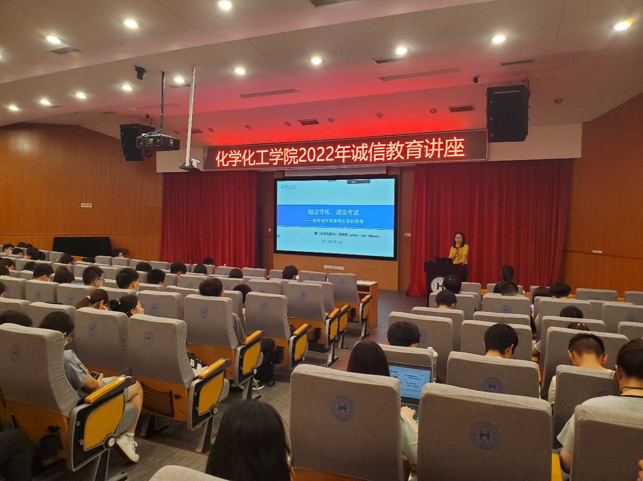 考试诚信教育工作是学生诚信教育的重要环节,也是学生自觉遵守校规校纪、形成良好学风的重要保证。春季学期期末考试和四六级考试即将来临,为做好我院学生的考试诚信教育工作,树立诚信考试价值观,5月31日晚上,学院团委在化学报告厅组织举办了“知法守礼 诚信考试”的主题诚信教育讲座。讲座邀请考试中心秘书、石井园区“一站式”兼职辅导员邱晓岚主讲,近两百名石井学生公寓四号楼、五号楼的本科生现场参会,线上参会同学三百余名。讲座由学院团委副书记冯石主持。