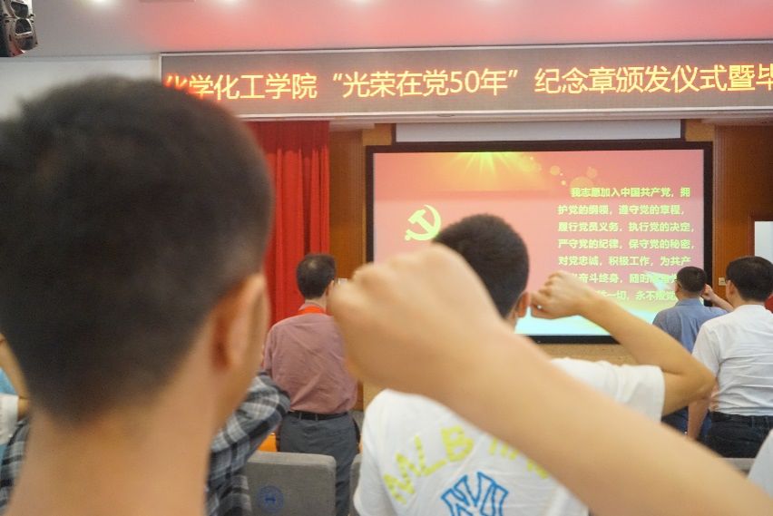 “我志愿加入中国共产党,拥护党的纲领,遵守党的章程,履行党员义务,执行党的决定,严守党的纪律,保守党的秘密,对党忠诚,积极工作,为共产主义奋斗终身,随时准备为党和人民牺牲一切,永不叛党。”重温入党誓词环节,由学院党委副书记刘俊杰领誓,大家肃然起敬,举起右拳,宣示对党的坚定信念和为党的事业奋斗终身的决心。铮铮誓言,字字千钧,回声久久响彻化学报告厅。