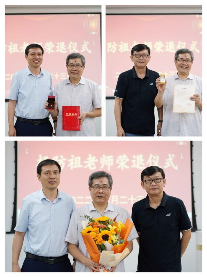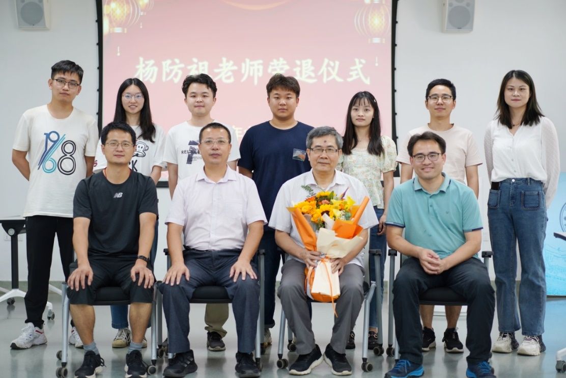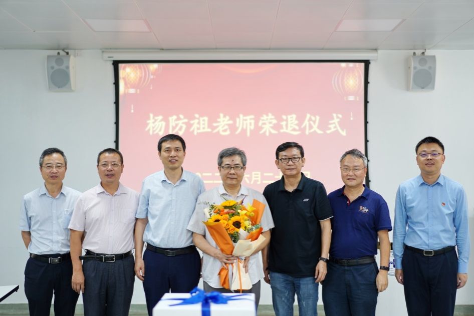 随后,宋毅书记和谢兆雄院长分别为杨防祖教授颁发学校和学院的荣誉奖章,并献上鲜花和蛋糕。学院领导和研究所领导共同与杨老师合影留念。