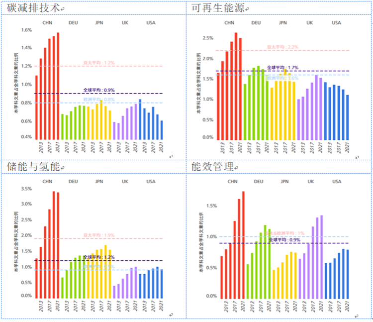 在重点国家中,中国在四个能源子学科的发文占比不仅远超对标国家,更高于全球平均水平(0.9%-1.7%不等)。储能与氢能是中国能源全学科占比最高的子学科,与其他对标国家相比的优势也最为突出。