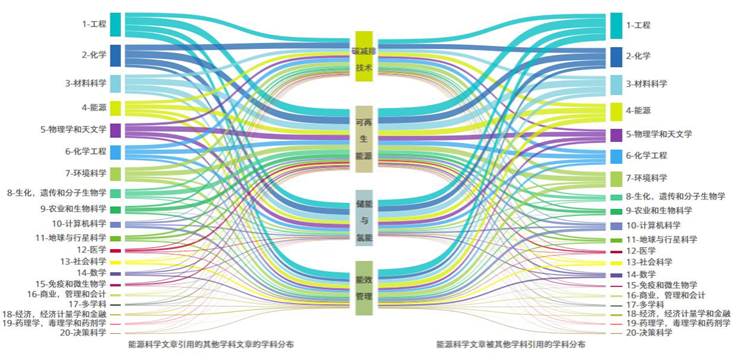 能源学科具有很强的交叉性,其文章的引用与被引涉及到众多学科,除了与其关系最密切的理科领域(化学、材料科学、能源、物理学和天文学等)和工程学科外,还涵括了生物学、社会科学、经济金融学以及商业管理学科等。