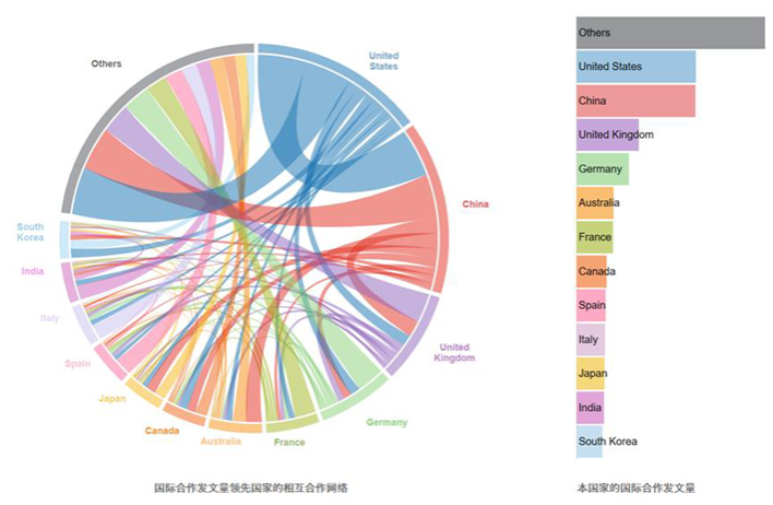 图:能源学科国际合作发文产出排名前12国家(右)以及各国间的合作关系图(左)(2010-2021)数据源:Scopus