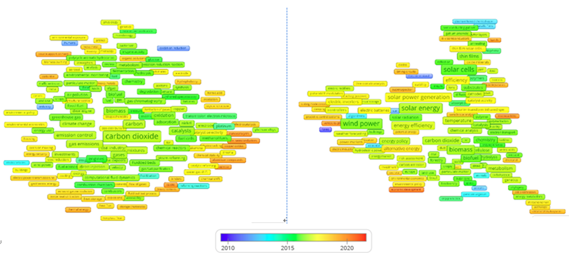 图:关键词内容变迁——碳减排技术子学科(左)、可再生能源子学科(右)(2010-2021)数据源:Scopus