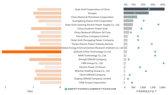 图:中国能源学科研究领域内发文量前二十产学合作企业的产学合作发文量、学科发文占比及FWCI(2010-2021)数据源:Scopus