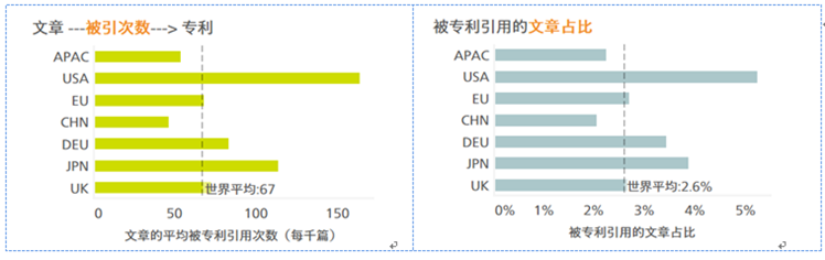 专利转化在科研文章被专利引用方面的表现上,美国是所有国家中最好的,亚太地区中日本的专利转化表现最好。这两个国家也是前文分析中产学合作占比以及产学合作科研影响力较高的国家。中国的专利转化表现仍然体现在规模性效益上,但是均值表现有待提升。
