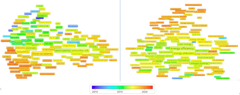 图:关键词内容变迁——储能与氢能(左)、能效管理(右)(2010-2021)数据源:Scopus