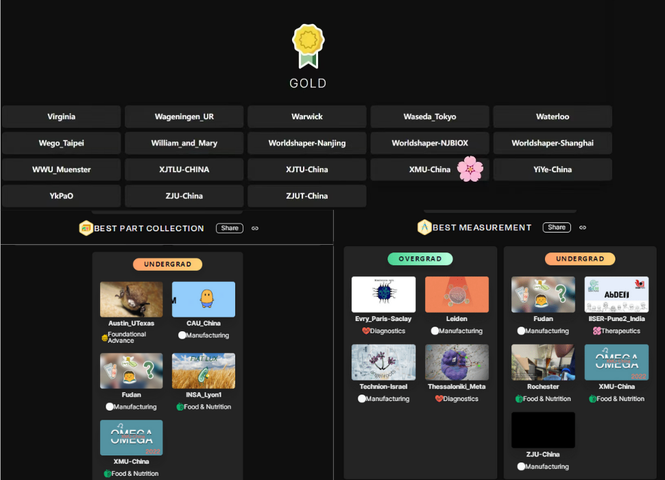2022年国际遗传工程机器大赛(简称iGEM)于北京时间10月28日20时落下帷幕。厦门大学本科生团队(XMU-China)从全球346支队伍中脱颖而出,斩获金奖。这是厦门大学参赛团队建队以来收获的第十二个金奖。此外,团队还获得“最佳生物砖收集”(Best Part Collection)、“最佳测量”(Best Measurement)两项专项奖提名奖。