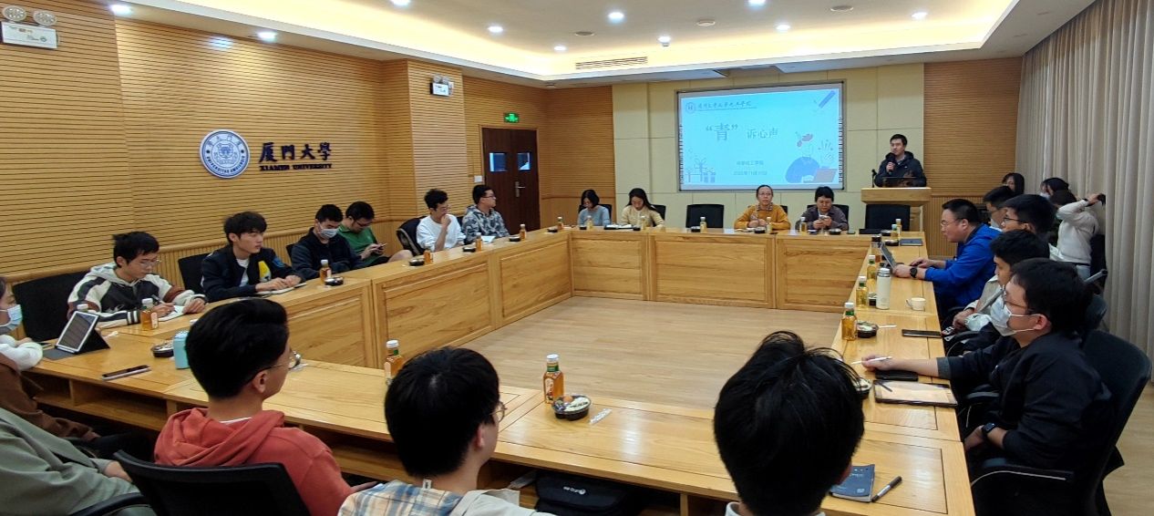 本科生提出学校医保政策的疑问、健康登记的事项、宿舍生活的问题等,学工组辅导员老师当场解读医保政策,引导树立“个人是疫情防控第一责任人”意识,同时本着“能解决的立刻解决,难解决的继续协调”的原则,立即联系公寓办等相关职能部门。就学生们关心的宿舍管理问题,党委副书记刘俊杰还谈起嘉庚先生督建学生公寓楼的理念与趣事,鼓励厦大学子要传承嘉庚精神,踔厉奋发、砥砺前行。研究生提到经济补助偏低、科研或就业实践较少的问题,副院长吕鑫教授回应“学院将探讨助研、助教岗位的增设与管理相关问题”。副书记聂鑫补充道“学校学院正在努力开展访企拓岗专项行动,以后将有更多的机会与企业交流合作,满足学生们想了解行业的期许”。伴随交流的深入,话匣子打开,现场气氛活跃、融洽。