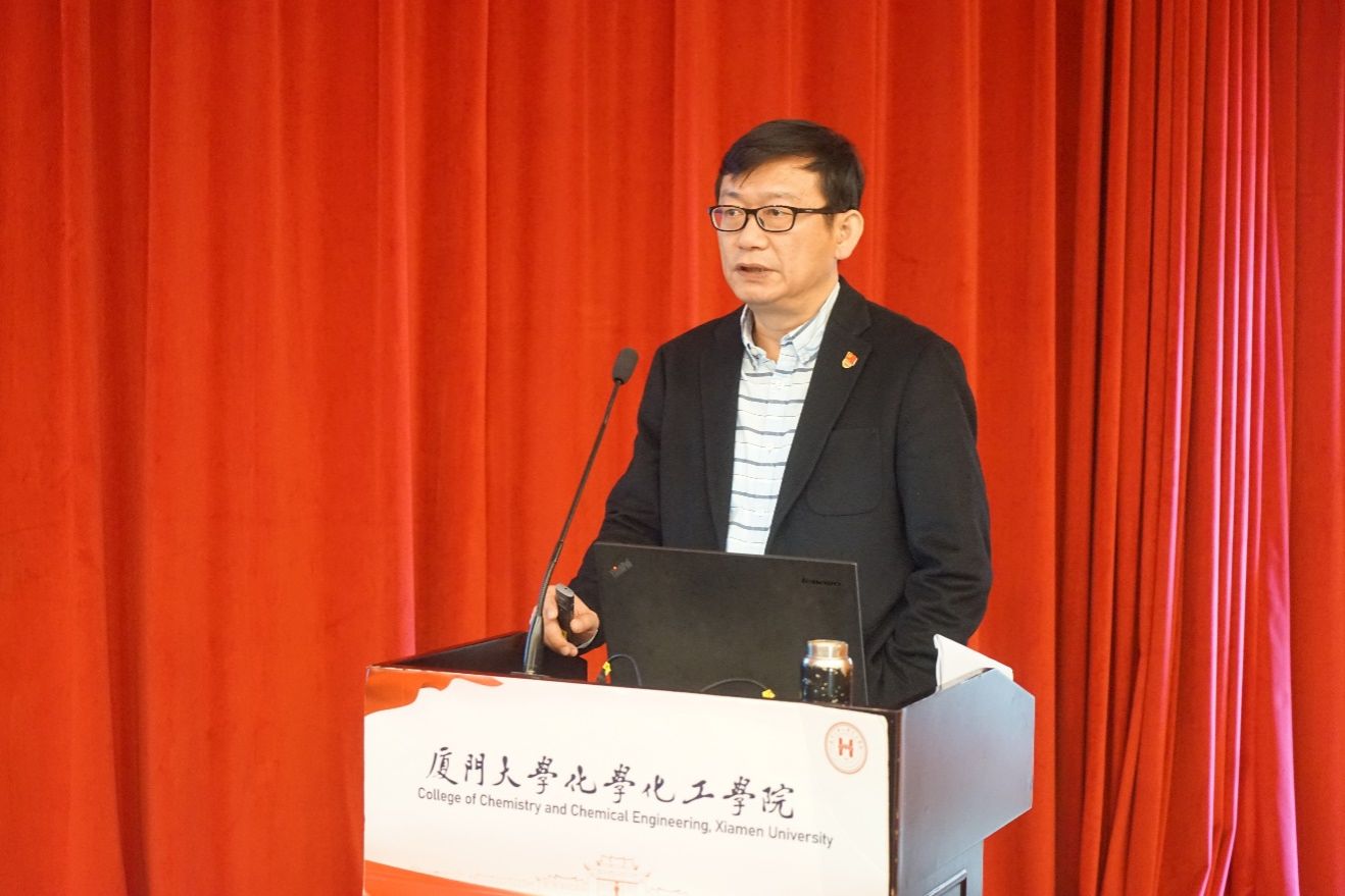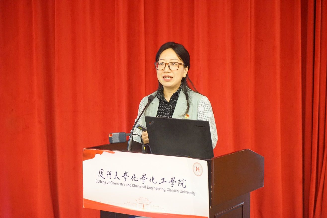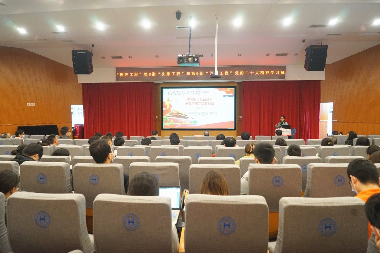 为深入学习宣传贯彻党的二十大精神,切实提升学习质效,不断推动党的二十大精神在学院落地生根开花结果,12月11日,化学化工学院“雁阵工程”第8期“头雁工程”暨第9期“雏雁工程”党的二十大精神学习班理论培训第二、三讲在思明校区化学报告厅举行。培训会同步面向翔安校区和漳州校区党员师生开通线上直播。学院特别邀请校党委党的建设工作办公室主任兼组织部副部长、教师工作部副部长、厦门大学学习贯彻党的二十大精神宣讲团成员廖志丹作《牢固树立党章意识,争做学用党章的模范》专题报告,学院党委书记宋毅讲授题为《学习贯彻党的二十大精神,推动党的建设与事业发展深度融合》的党课。学校基层党建工作联络员白锡能,学院党政班子、党委委员以及“头雁工程”“雏雁工程”的全体学员共同参加学习。培训会由学院党委副书记刘俊杰主持。