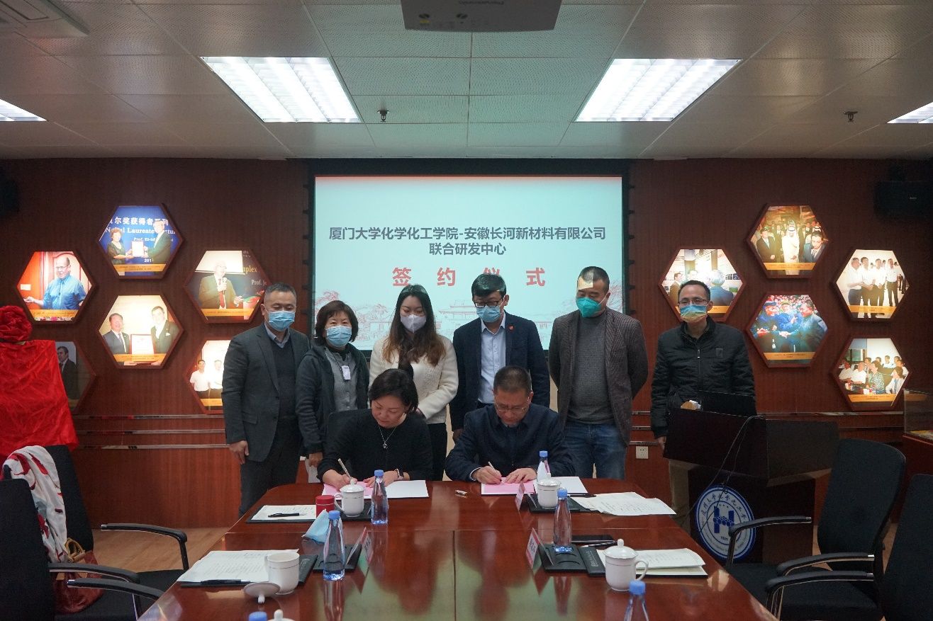 12月19日,“厦门大学化学化工学院——安徽长河新材料有限公司联合研发中心” 签约暨揭牌仪式在卢嘉锡楼215会议室举行。安徽长河新材料有限公司(以下简称“长河公司”)董事长陈敏、股东陈仲亚、王雯杰、法律顾问于玉芬,学院党委书记宋毅以及詹庄平教授、张延东教授、黄加乐教授等出席仪式。仪式由学院有机研究所所长张延东主持。