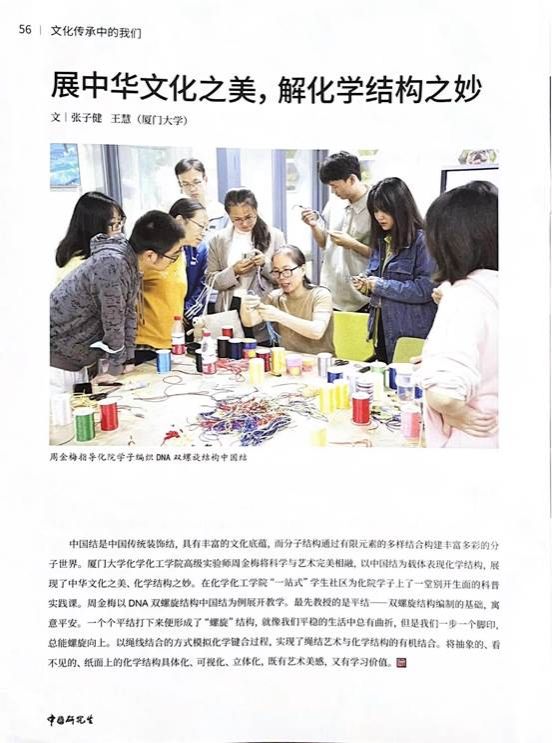 厦门大学化学化工学院周金梅高级实验师和张慧君教授于2021年牵头成立了“结绳探构”团队。该团队从2021年初开始在大、中、小学和社区开展系列“结绳探构”科普活动,以特色中国结为载体科普化学结构之美、化学结构之妙,让大众在亲手编结的过程中体验化学键合丰富的创造性。