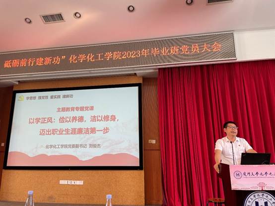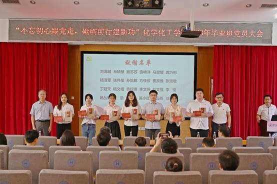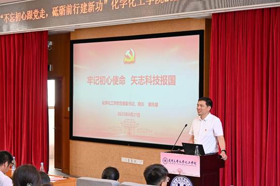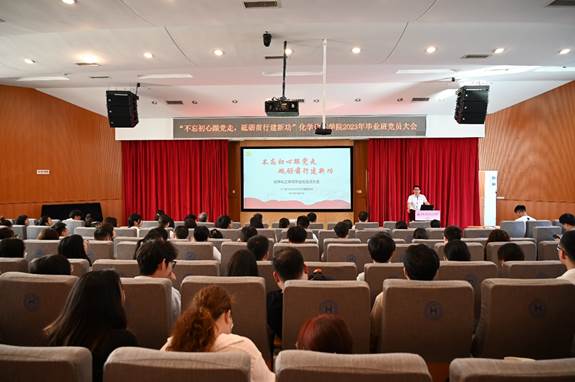 为深入开展学习贯彻习近平新时代中国特色社会主义思想主题教育,喜迎中国共产党成立102周年, 6月21日上午,化学化工学院在化学报告厅举行“不忘初心跟党走,砥砺前行建新功”2023届毕业班党员大会。校基层党建联络员白锡能,校第五巡回指导组组长郑建华,学院党委书记宋毅,学院党委副书记、院长谢兆雄,学院党委委员、固体表面物理化学国家重点实验室副主任林清育及毕业生党员参加大会。会议由学院党委副书记刘俊杰主持。