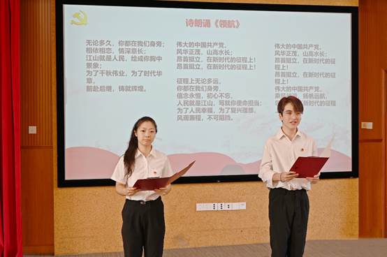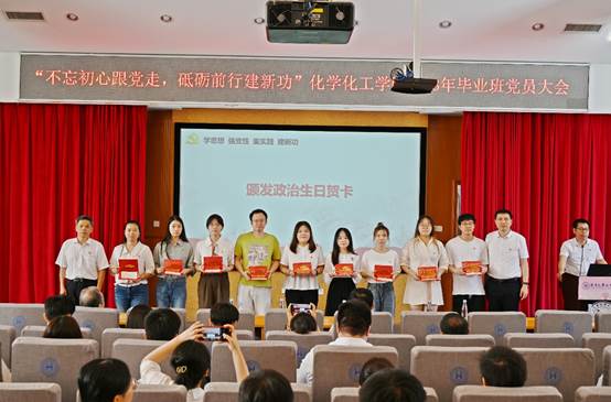 大会还为全体6月份入党的毕业班党员同志特别准备了一次别开生面的集体政治生日。党员代表2021级硕士研究生于亚楠、2022级本科生阿迪力江·阿力木为大家献上一段声情并茂的诗朗诵《领航》,与会领导为56名党员同志一一送上政治生日贺卡。