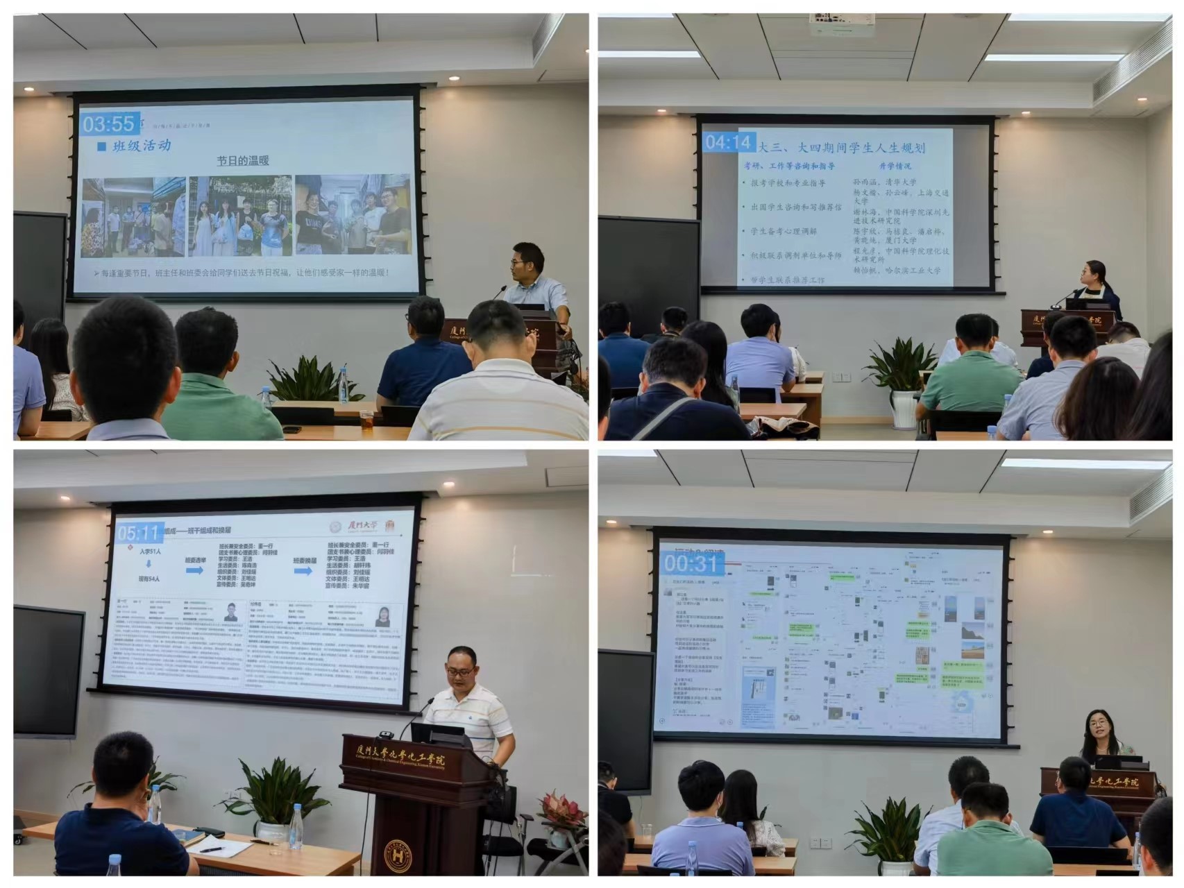 本次由2019级和2021级的14位班主任进行述职报告,各位班主任结合班级实际情况分享了在思想政治引领、班团组织建设、学风建设和学业指导等各方面的经验做法和心得体会。高年级班主任重点梳理了针对三、四年级学生的学风管理、学科竞赛指导、毕业规划指导帮助等工作,低年级班主任着重分享在大学生学习生活适应、科研训练项目课题申报指导、针对性的专业指导以及职涯学涯规划指导前置等方面开展的特色工作。