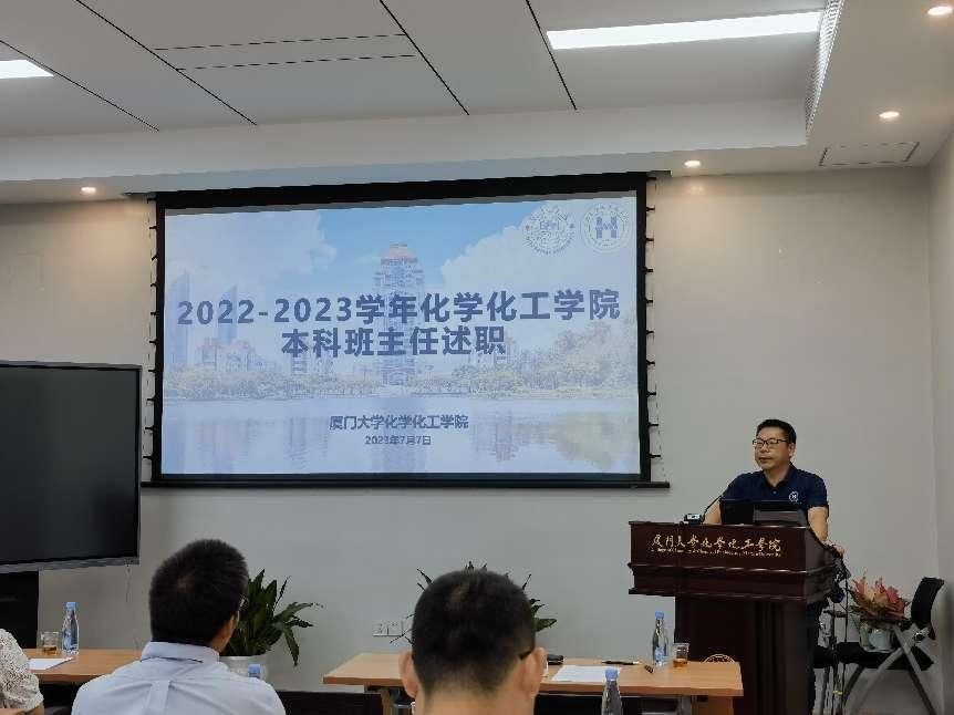 为深入贯彻落实习近平新时代中国特色社会主义思想,进一步贯彻落实全国高校思想政治工作会议和全国教育大会精神,加强班主任队伍的培养、管理与考核,深化学院的辅导员-班主任-本科生导师联动工作机制,7月7日上午,学院在同安二201会议室举办2022-2023学年本科班主任述职评议大会。学院党委书记宋毅、副书记刘俊杰、化生系副主任朱志、化工系副主任黄加乐出席本次会议并担任评委,本科各班班主任参与学习。