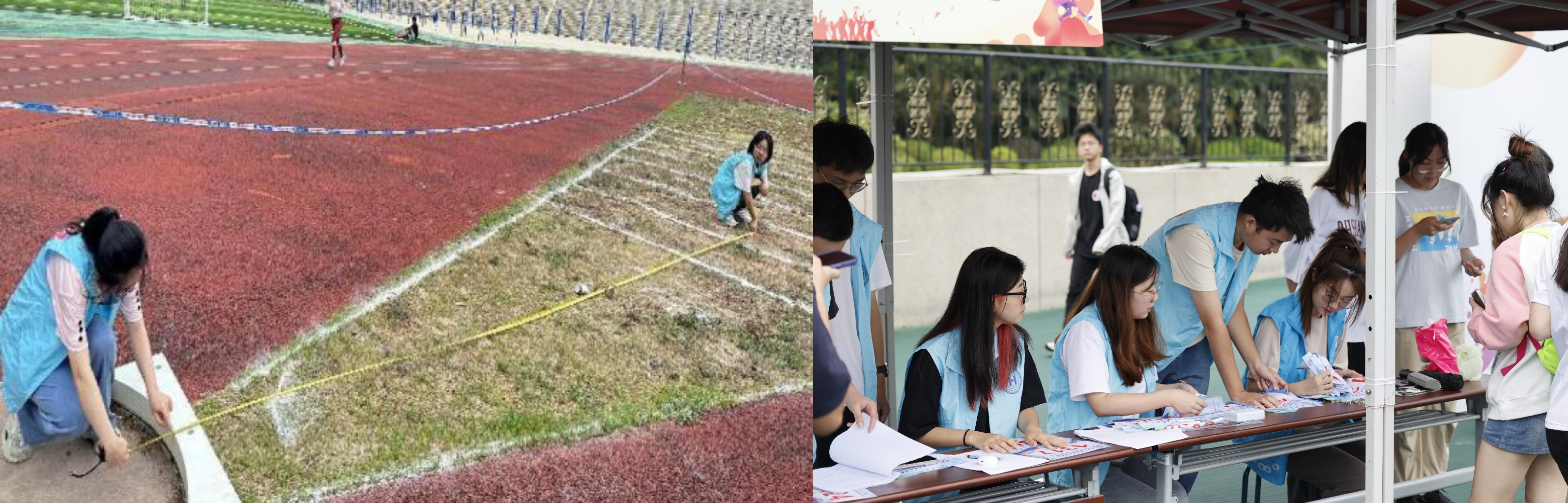 幕后人员们辛勤工作的身影也是院运会上一道靓丽的风景线。学院学生工作组和工会的老师们都亲临一线、组织动员,研究生会和学生会各部门分工协作、密切配合,还有随处可见的“蓝马甲”们穿梭在赛场中,为比赛工作提供了一对一保障,使运动会比赛秩序井然,气氛热烈,所有人都在自己的岗位上默默耕耘,热心奉献。