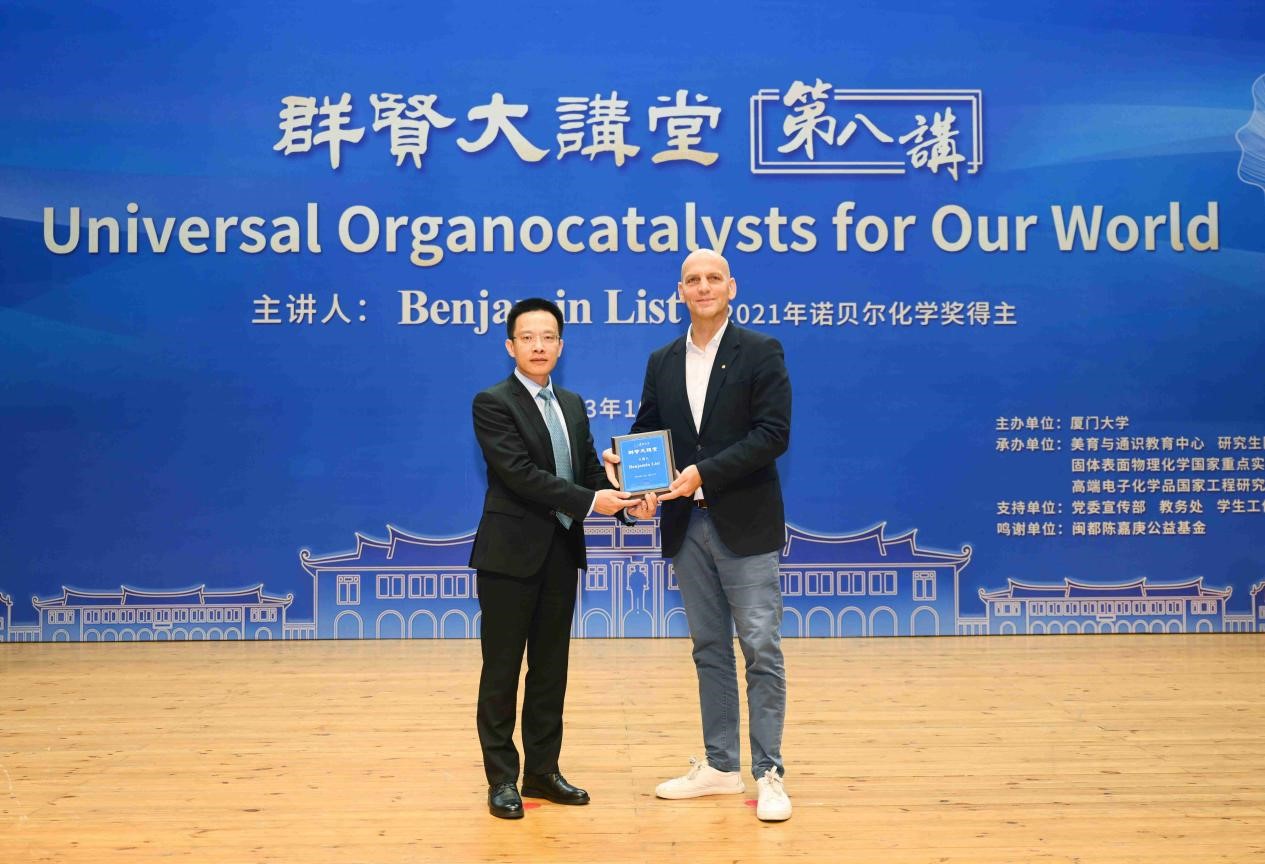 10月17日晚,厦门大学“群贤大讲堂”第八讲在思明校区科学艺术中心音乐厅举办。2021年诺贝尔化学奖得主、德国马克斯-普朗克煤炭研究所所长本亚明·利斯特(Benjamin List)教授受邀为师生带来一场题为“Universal Organocatalysts for Our World”的精彩报告。史大林副校长出席活动并为利斯特教授颁发“群贤大讲堂讲座”纪念牌。中国科学院院士田中群教授主持活动。活动现场座无虚席,师生、校友代表等近600人相聚音乐厅,不愿错过这场与诺贝尔奖得主“面对面零距离”的学术盛宴。