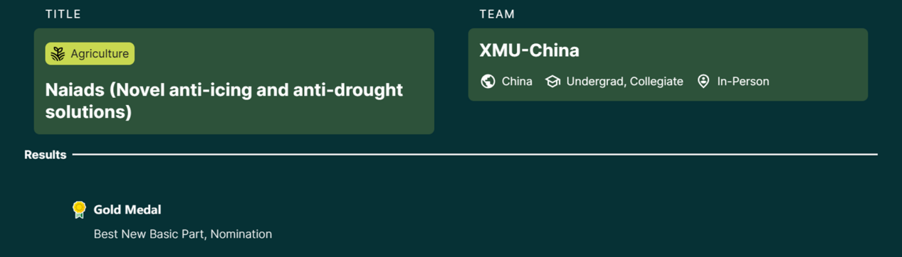 “XMU-China”团队队员来自厦门大学化学化工学院、生命科学学院、信息学院、公共卫生学院、艺术学院、药学院、外文学院等多个院系,横跨理科、工科、医学、外语等多个学科。在化学化工学院张瑷珲博士和洪文晶教授的带领下,团队深入开展田野调查,充分运用合成生物学的思路和方法,为农业生产中的干旱和冻害问题提供可行的解决方案。在决赛现场的激烈角逐中,团队凭借专业严谨的实验成果、流利自如的演讲答辩、精致生动的视频展示得到了大赛评委专家的高度认可。